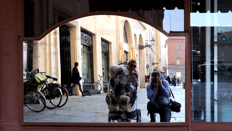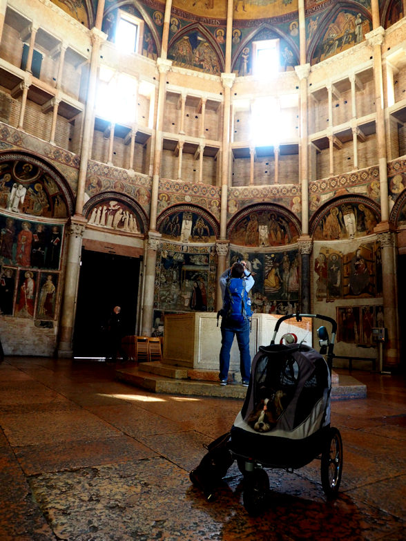 Und dann stehen wir in einem der Highlights von Parma: im Battisteo – der Taufkirche. Ja, wir haben vorher schon mal Bilder hiervon in Reiseführern gesehen, aber auch ja: es ist in live viel schöner als auf den Bildern. Wir sind ganz alleine hier, nur wir vier…oder nein: ein plötzliches „Que carini! – wie putzig!“ lässt uns alle ein wenig zusammenzucken. Eine Studentin, die die Biglietti kontrolliert, hat unsere Hunde entdeckt und kommt aus der kleinen Eingangspforte herausgestürmt. Schwupps hat sie den Kopf bei Allie und Amadeo im Wagen und schmust intensivst mit den beiden.