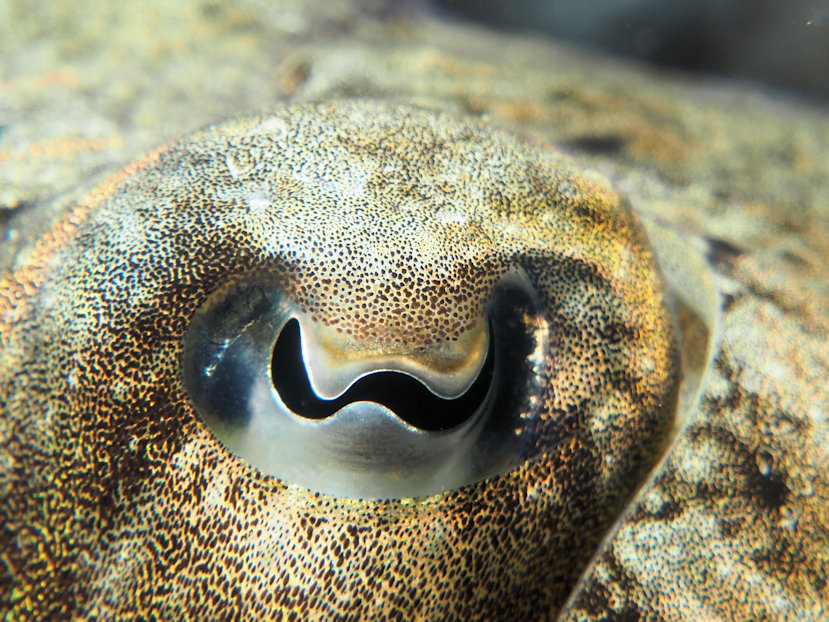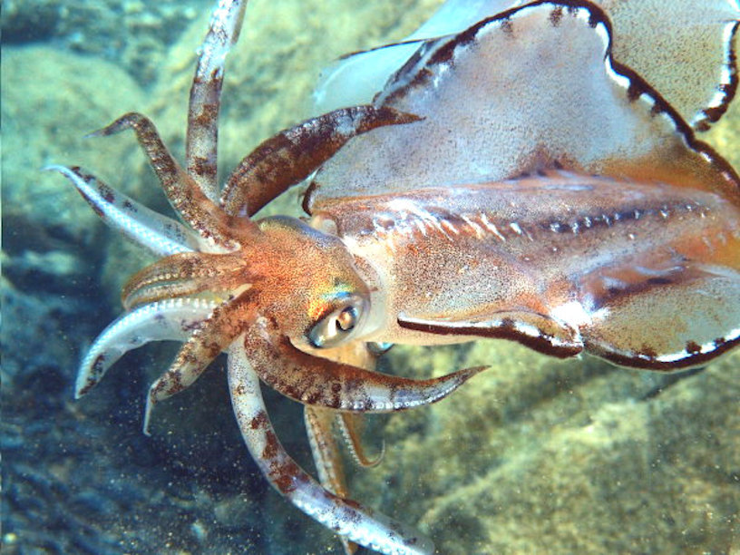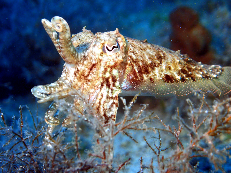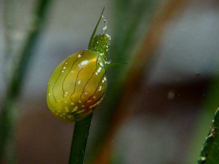 Nur noch eine bisschen…..ich glaub’s nicht, da ist tatsächlich ein Seepferd. Wie anmutig….und da eine Sepia, zwei Kalmare beim Liebesspiel….ein Tauchplatz zum träumen. Jetzt noch die letzten Minuten voll auskosten. Eine winzige, unbekannte Schnecke hängt an einem Seegrasbüschel und eine bunt schillernde Kopfschildschnecke, die über den Sand kriecht, muss noch aufs Bild.