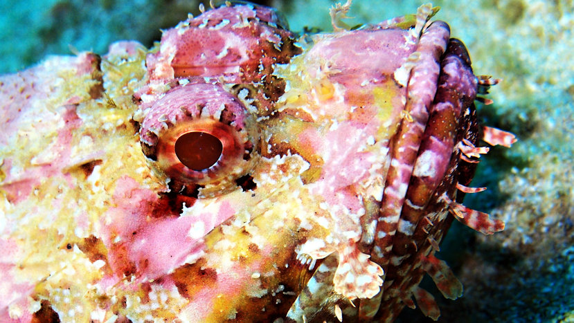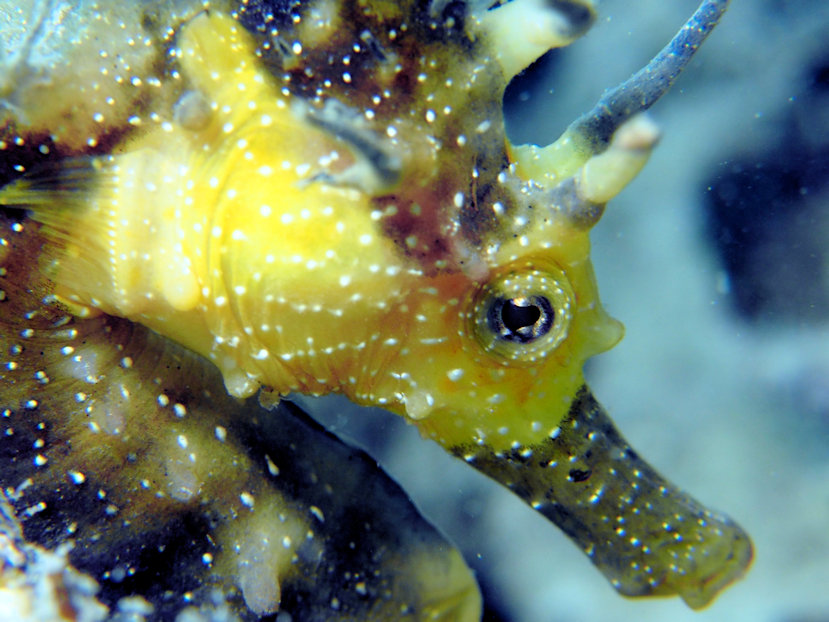 Bereits eine halbe Stunde ist seit dem Abtauchen vergangen. Dein Luftvorrat sieht noch gut aus und so kannst Du Dir für die Erkundung des Bereiches um die 10 Meter Wassertiefe, an dem das Riff besonders zerklüftet ist und viele Überhänge und kleine Löcher bietet, noch jede Menge Zeit lassen. Und es lohnt sich. Farbexplosionen unter Wasser…und irgendwie wollen alle auf’s Bild…sie halten still und es macht riesigen Spaß sie bei diesen ruhigen Bedingungen abzulichten. Ab und an macht Dein Herz einen Hüpfer, denn bereits an der nächst einsehbaren Kante sitzt ein weiteres Juwel….
