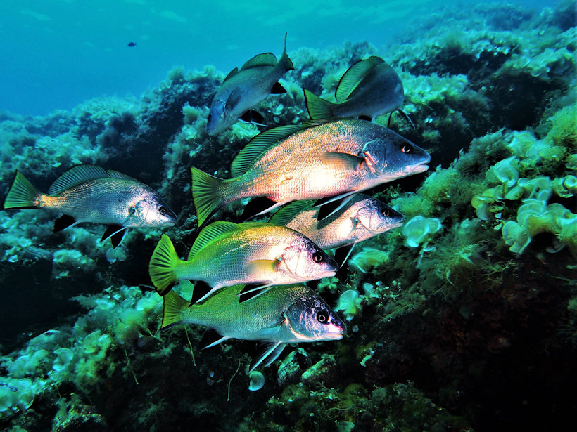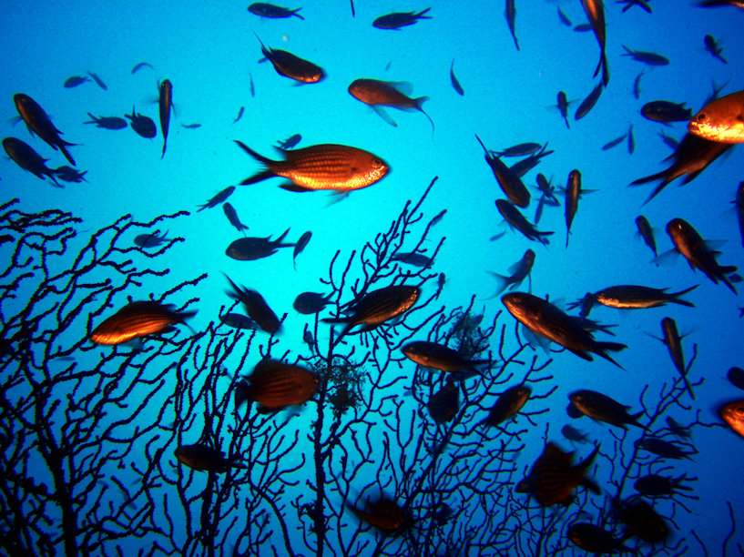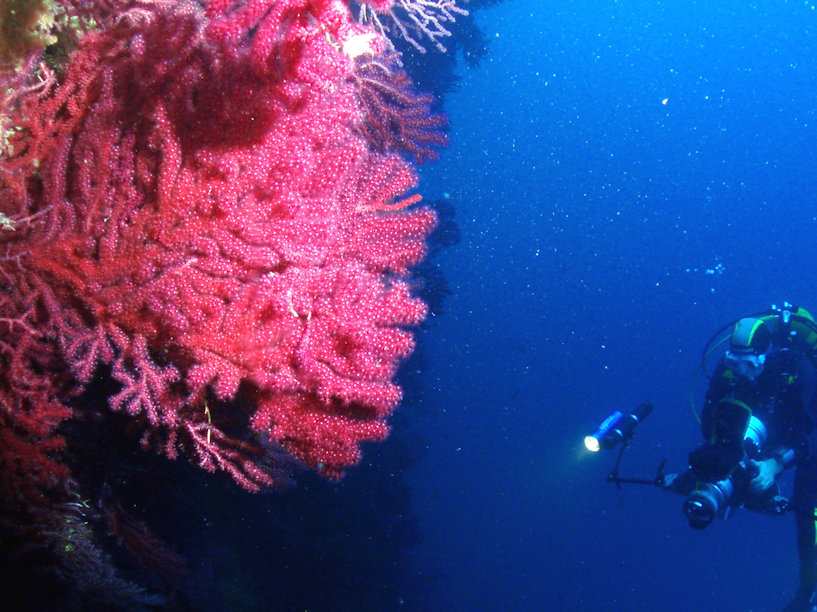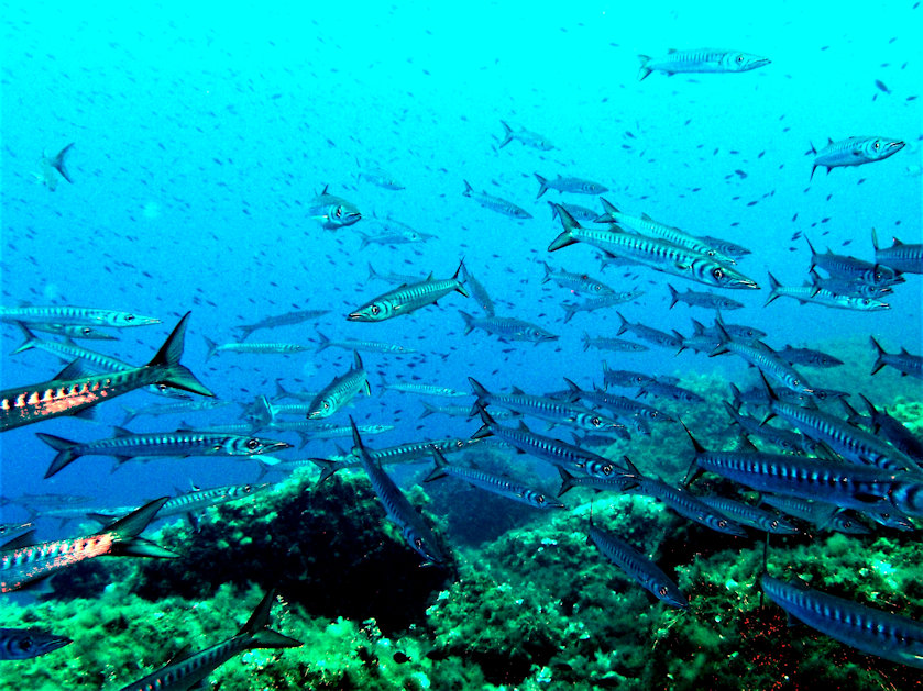 …und dann ist sie da: diese Stille….nur das Blubbern Deines eigenen Atems, Du hörst Deinen Buddy neben Dir und sonst nichts. Du lässt Dich fallen und schaust nach unten…ein atemberaubendes Blau öffnet sich und die plötzliche Freude lässt Dein Herz etwas schneller schlagen. Dein Weg führt Dich zuallererst zu den wundervollen Gorgonien hier am Tauchplatz „Phantasia“….in etwa 25 Metern Tiefe beginnen Sie, diese wundervollen, farbenprächtigen Gebilde. Kurz vor Euch gleitet eine alte Schildkröte am Riff entlang….was für ein Gefühl…und das hier im Mittelmeer. Im Blau taucht eine Schule Gelbflossenbarakudas auf. Deine Atemfrequenz wird langsamer und für einen Moment vergisst Du alles….vielleicht sogar kurz Deinen Buddy…