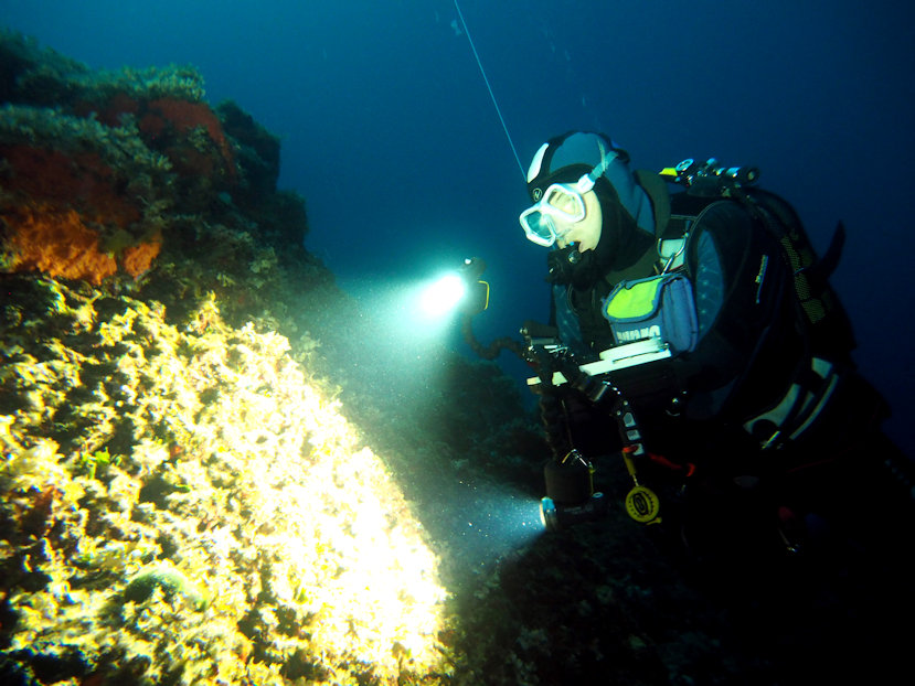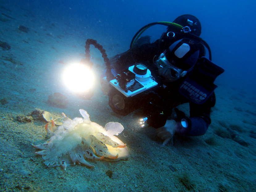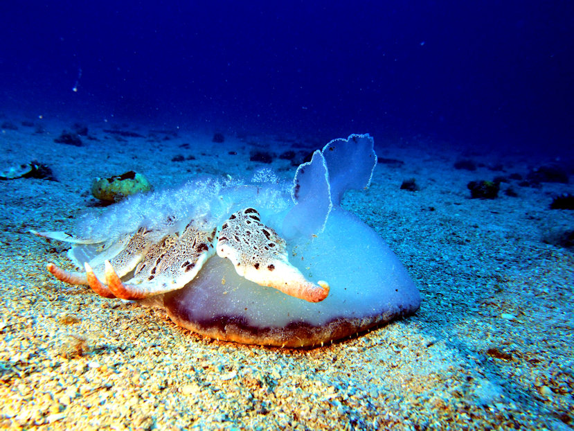 Dein Tauchgang führt Dich der Struktur dieses überwältigenden Unterwasserrückens folgend in geringere Tiefe so um die 15 Meter. Hier möchtest Du Dir das Riff und seine Bewohner etwas genauer ansehen. Dein Buddy, der Dir in etwas Entfernung folgt, meldet sich plötzlich mit seiner „Hupe“ und schon als Du Dich rumdrehst, glaubst Du Deinen Augen nicht zu trauen. Wie lange hast Du davon geträumt, genau diese im Mittelmeer größte, vorkommende Nacktschnecke zu sehen. Und nun ist der Moment plötzlich da. Vor lauter Freude erhöht sich Deine Atemfrequenz und Du bemühst Dich, trotz aller Aufregung, diese Begegnung gut im Bild festzuhalten.
