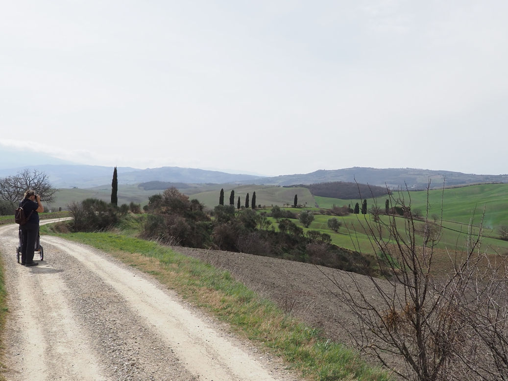 Wir haben uns den Weg über den Aussichtspfad und das Romitorio ausgesucht. Kurz hinter der Pieve die Corsignano fällt unserem Amadeo ein, dass es ihm schon viel zu warm zum Laufen ist. Unseren „Citywagen“ haben wir nicht dabei. Oder besser: wir haben ihn noch nicht dabei!