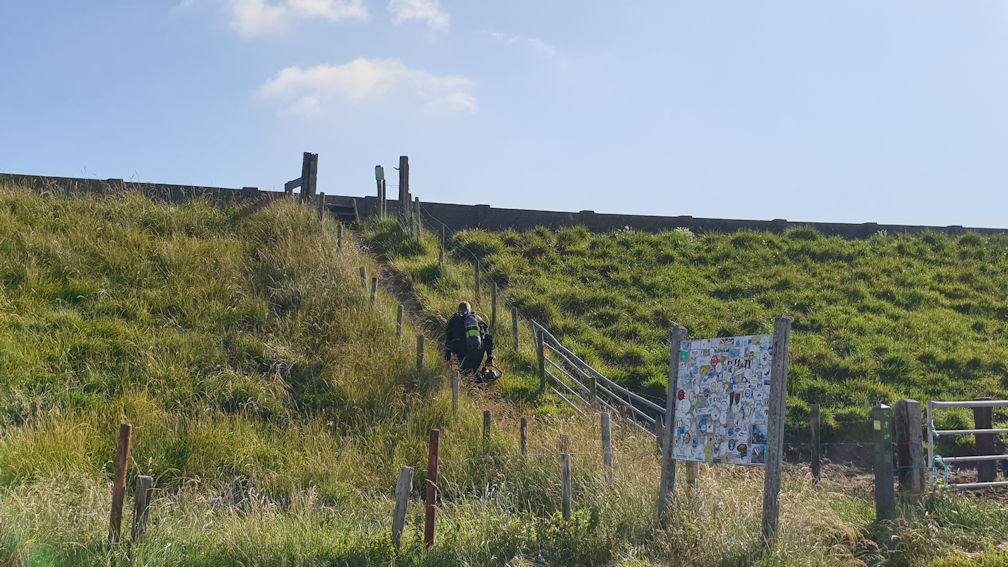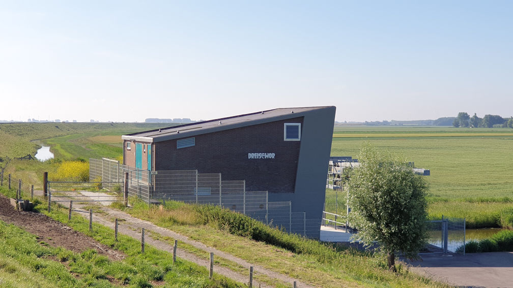 Von hier aus führt uns unser Weg ins Zentrum, den die für den kleinen Ort recht große Kirche bildet. Rund herum befinden sich kreisförmig angeordnet, dicht an dicht, wunderschöne, typische Häuser. Allie und Amadeo genießen ihre Gassirunde und das darauffolgende Frühstück. Auf unser Frühstück müssen wir leider noch etwas warten, denn zuerst heißt es in Dreischor am Frans Kok Riff die Flaschen füllen und dann geht es weiter über den schmalen Weg zur Pumpanlage und dem dazugehörigen Tauchplatz Dreischor Gemaal.