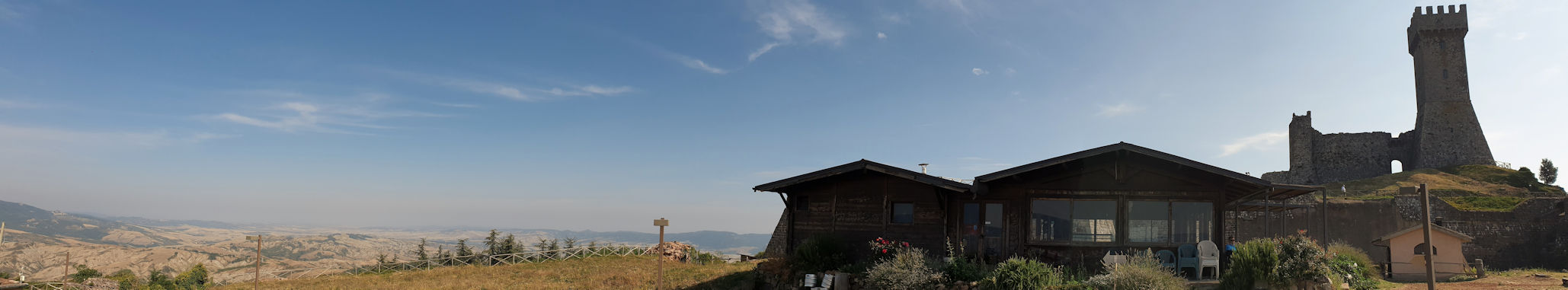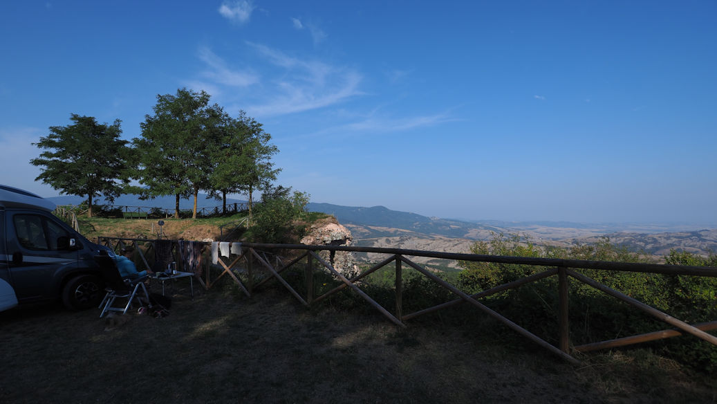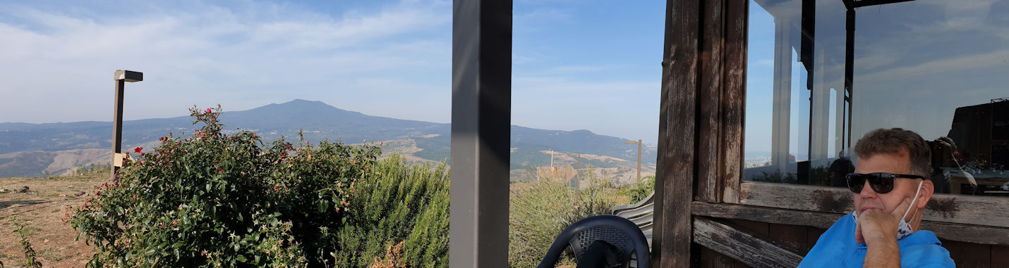 Wir sind schon früh wach und unsere Fahrt beginnt bereits gegen acht Uhr. Über Piancastaio erreichen wir gegen 9 Uhr die Fortezza in Radicofani, die Burg des Ghino di Tacco, dem angeblichen Robin Hood des Val d’Orcia. Als wir zum letzten Mal hier waren, hatten wir Pici all’Aglione zum Mittagessen und wurden liebevoll von der englischen Besitzerin belehrt, dass man dazu keinen Parmeggiano ißt…..und wen treffen wir heute….besagte Engländerin, die übrigens Carmen heißt und uns für unsere nächste, hoffentlich covidfreie Tour schonmal die Adresse ihres Agritourismos mit Womostellplätzen gibt. Ein nettes Schwätzchen und ein wenig Lachen….ja das war eine wirklich nette Begegnung….