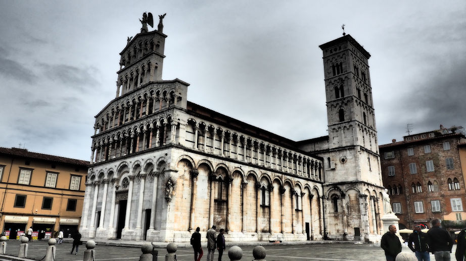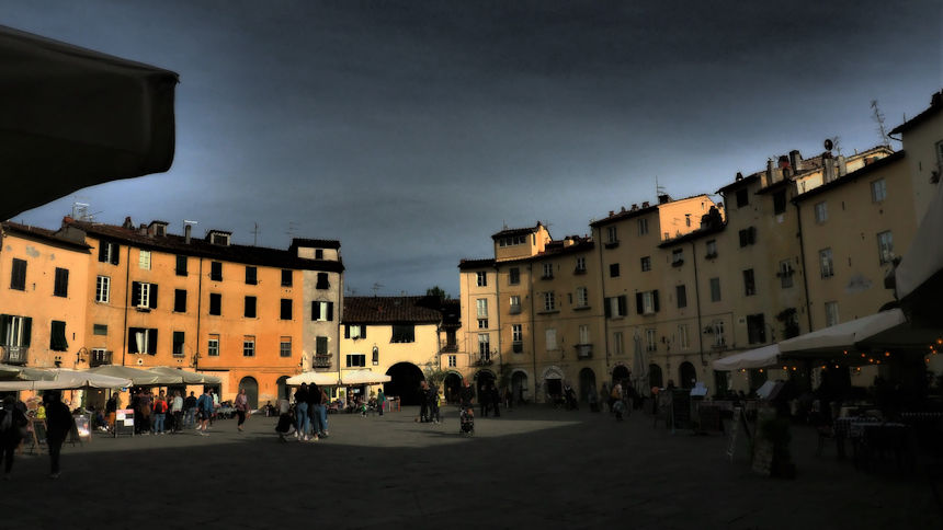 Über das Puccinidenkmal, San Michele, den Dom und den Guinigiturm führt uns unser Magen auf die Piazza Anfiteatro, die Arena, die im Oval gebauten Häusern aus Platzgründen weichen musste. Erhalten blieb der einzigartige Platz.