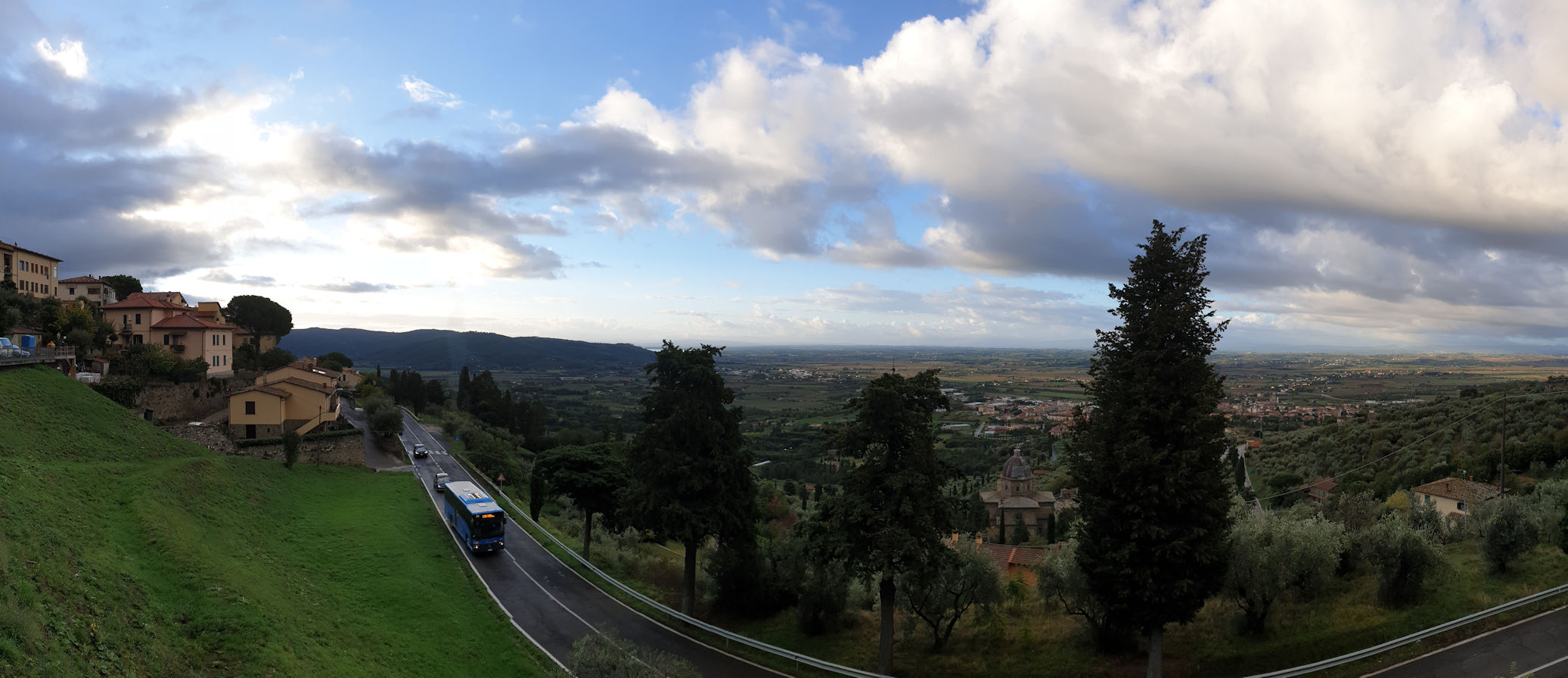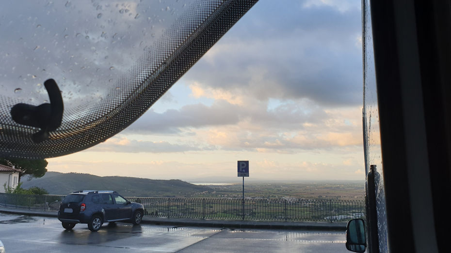Wir hatten eine nicht so erholsame Nacht. Ralf war es schlecht und der Regen trommelte in heftiger Lautstärke aufs Dach. Doch heute Morgen sieht Alles anders aus. Die Wolken reißen auf und die Sonne scheint über die unter uns liegende Toskana und Teile Umbriens. Ein wunderbarer Anblick von hier oben auf diesem Aussichtsplatz in Cortona.