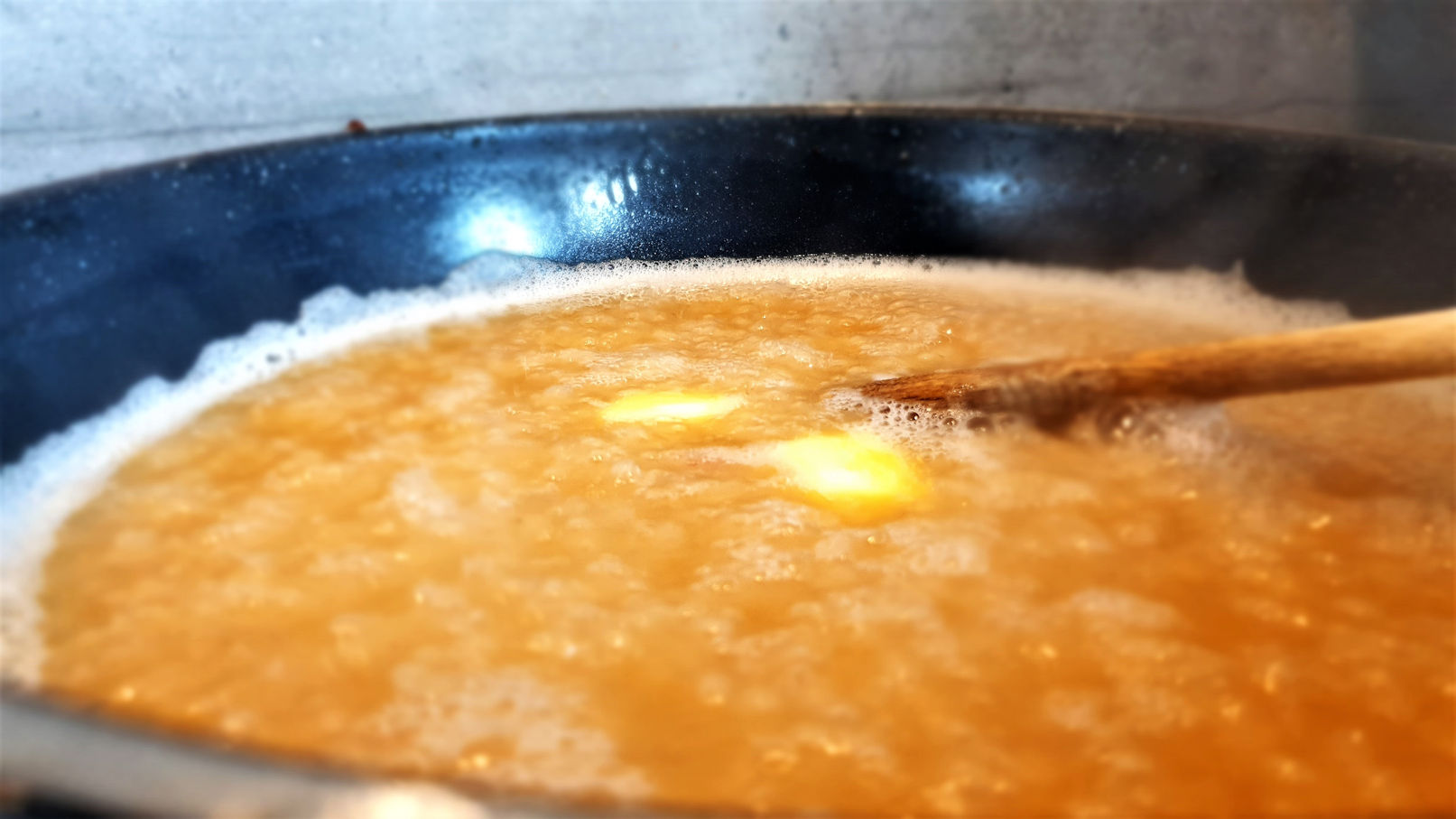 Den Bratensud mit einem leckeren, trockenen Weißwein aufgießen, etwas Butter und ggf. etwas Mehl zum Andicken benutzen. Und dann dürft Ihr den Grund, warum diese kleinen ummantelten Schnitzel als „Spring in den Mund“ bezeichnet werden, nämlich die Soße selbst abschmecken. Wir benutzen Salz, Pfeffer und falls Euch die Sauce zu sauer erscheint das kleine Küchengeheimnis der Italiener heißt: Zucker…