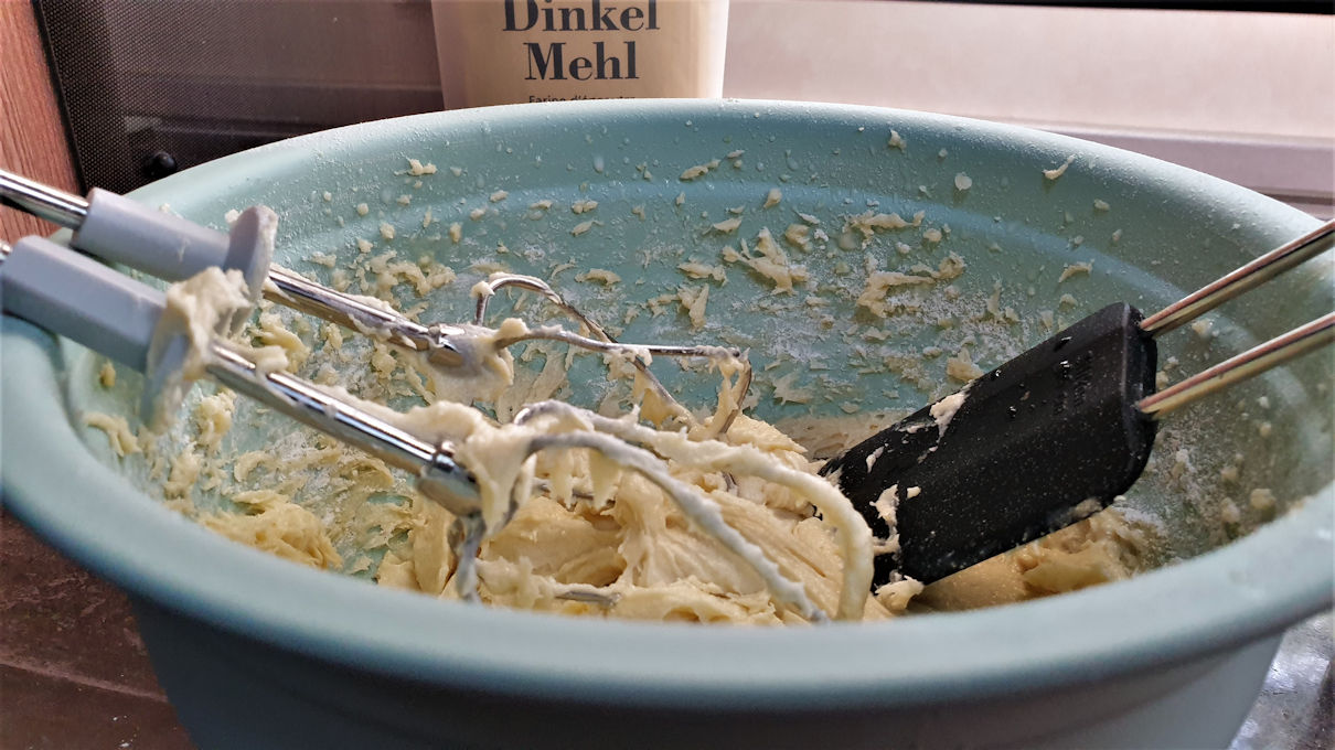 Unser Abendvergnügen beginnt mit dem Zubereiten eines einfachen Rührkuchens (halbes Rezept) und dem Anwerfen unseres mit extra hohem Glasdeckel versehenen Backtopfes.