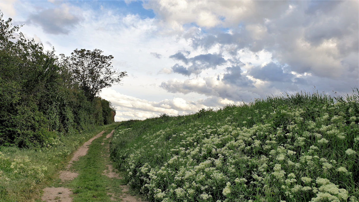 Unsere Wanderung führt uns am nördlichen Ortsrand entlang, an durch den starken Wind wiegenden Jungkornfeldern vorbei. An einem Renaturierungsprojekt machen wir die von Allie und Amadeo lang ersehnte Pause. Nicht zum Ausruhen. Viel wichtiger…Frühstückspause…und immer mit dem Winnetou Soundtrack im Ohr…