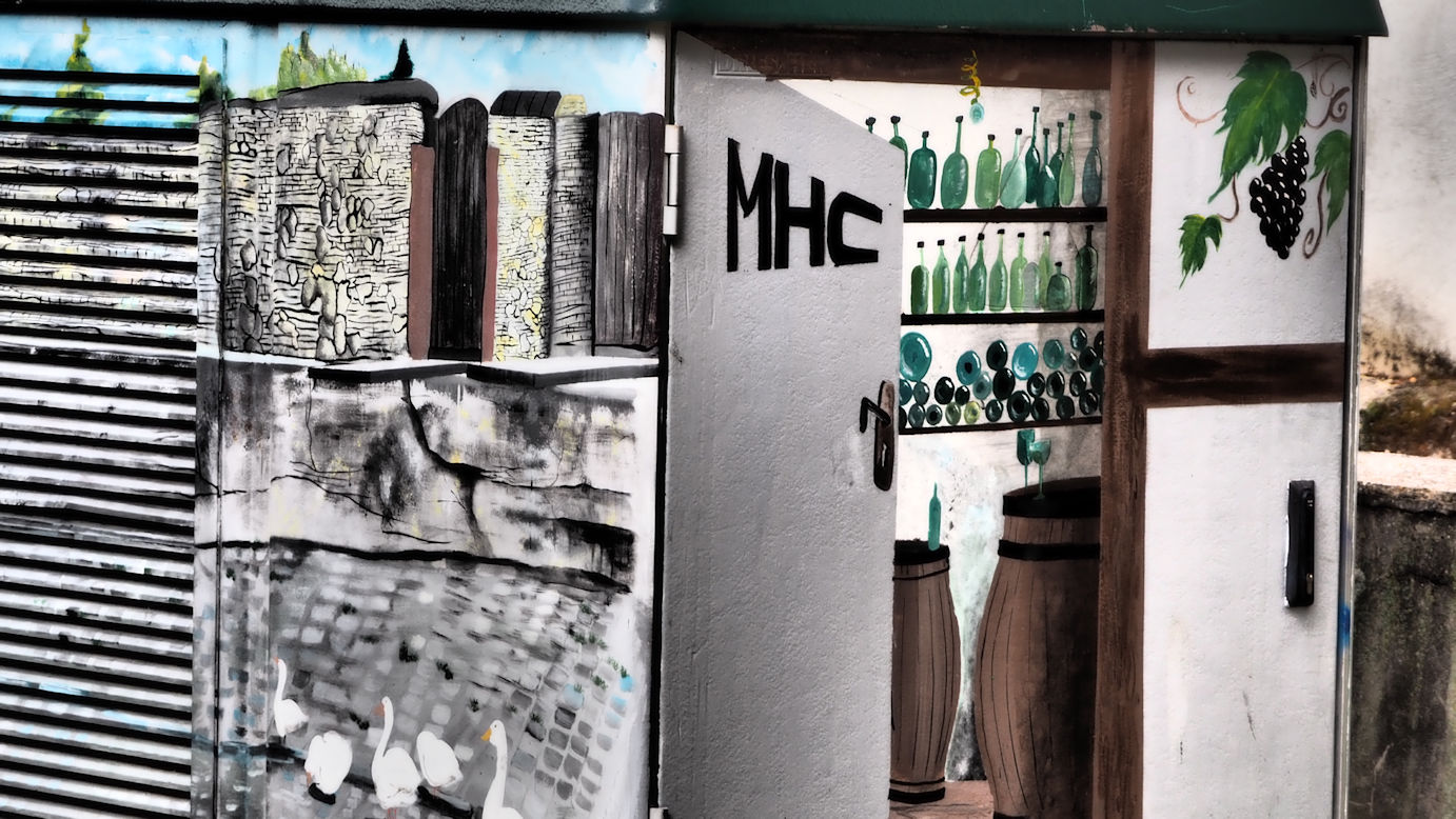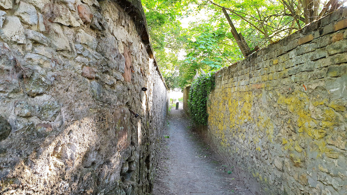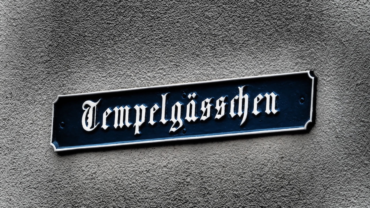 Über die Bergkirche geht es durch den kleinen Weinort immer der mit Komoot geplanten Route entlang. Durch’s Tempelgässchen (noch so ein lustiger Name) geht es an einem kleinen Bach entlang zum nächsten Schild, das uns schmunzeln läßt.