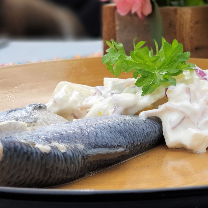 Als wir gegen halb drei hier parken, ist es Zeit für ein nettes Mittagessen. Hering an Apfel/Zwiebelsahne mit Walnussbrot. Vorweg und dazu ein wenig frischer Salat.