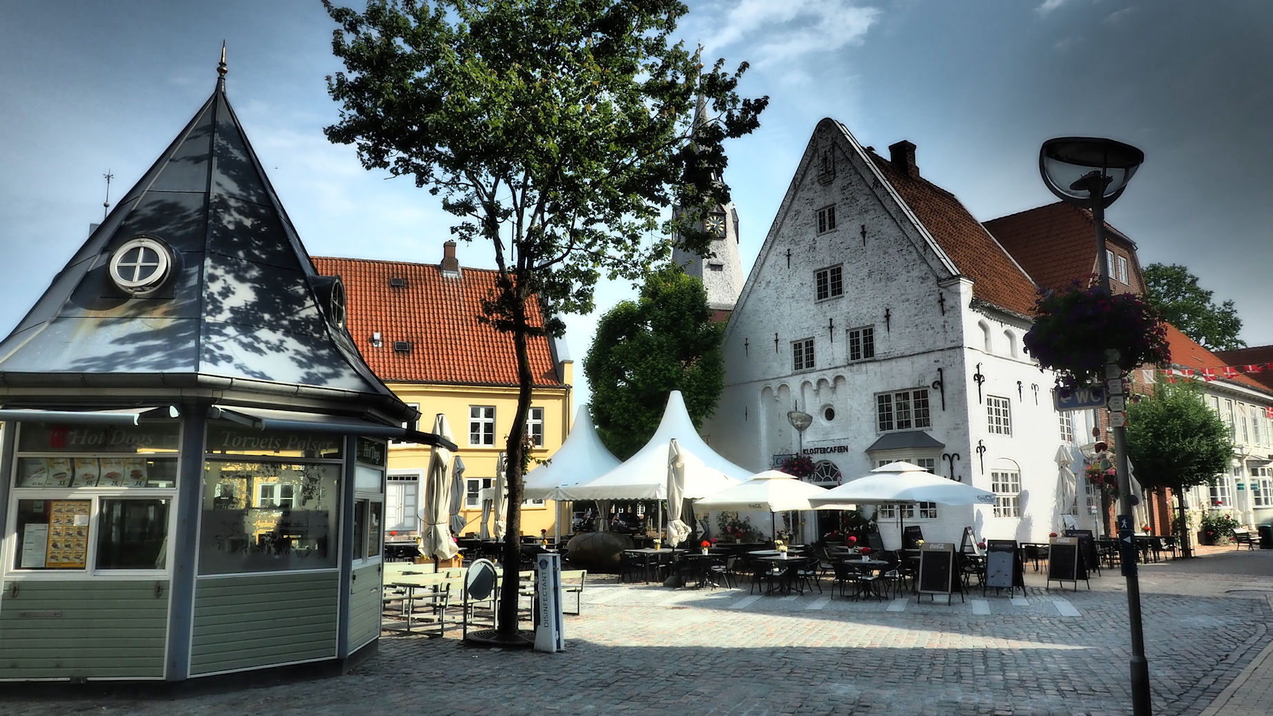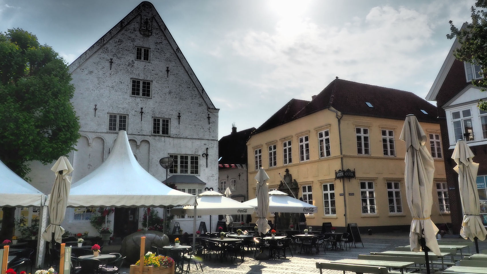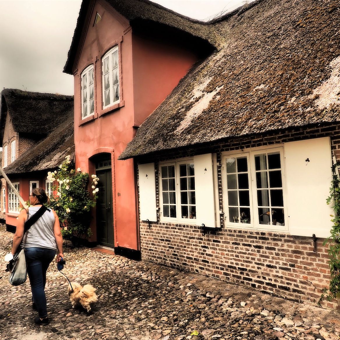 Mitten im Zentrum befinden sich wundervolle alte Häuser eines Klosters und die „Gamle Apotek“, die alte Apotheke. Heutzutage ein Laden für Deko und schöne Dinge. Aber wir sind zu früh hier. Nicht nur dieser Laden hat geschlossen. Die ganze Kleinstadt ist gerade erst am Erwachen. Dennoch macht es Spaß, durch die Gassen zu schlendern und die bewundernden Blicke für unsere Hunde zu genießen. Der ein oder andere Passant spricht uns auch an, aber außer ein paar Begrüßungsfloskeln gibt bei uns kein Dänisch. Jedenfalls noch nicht!