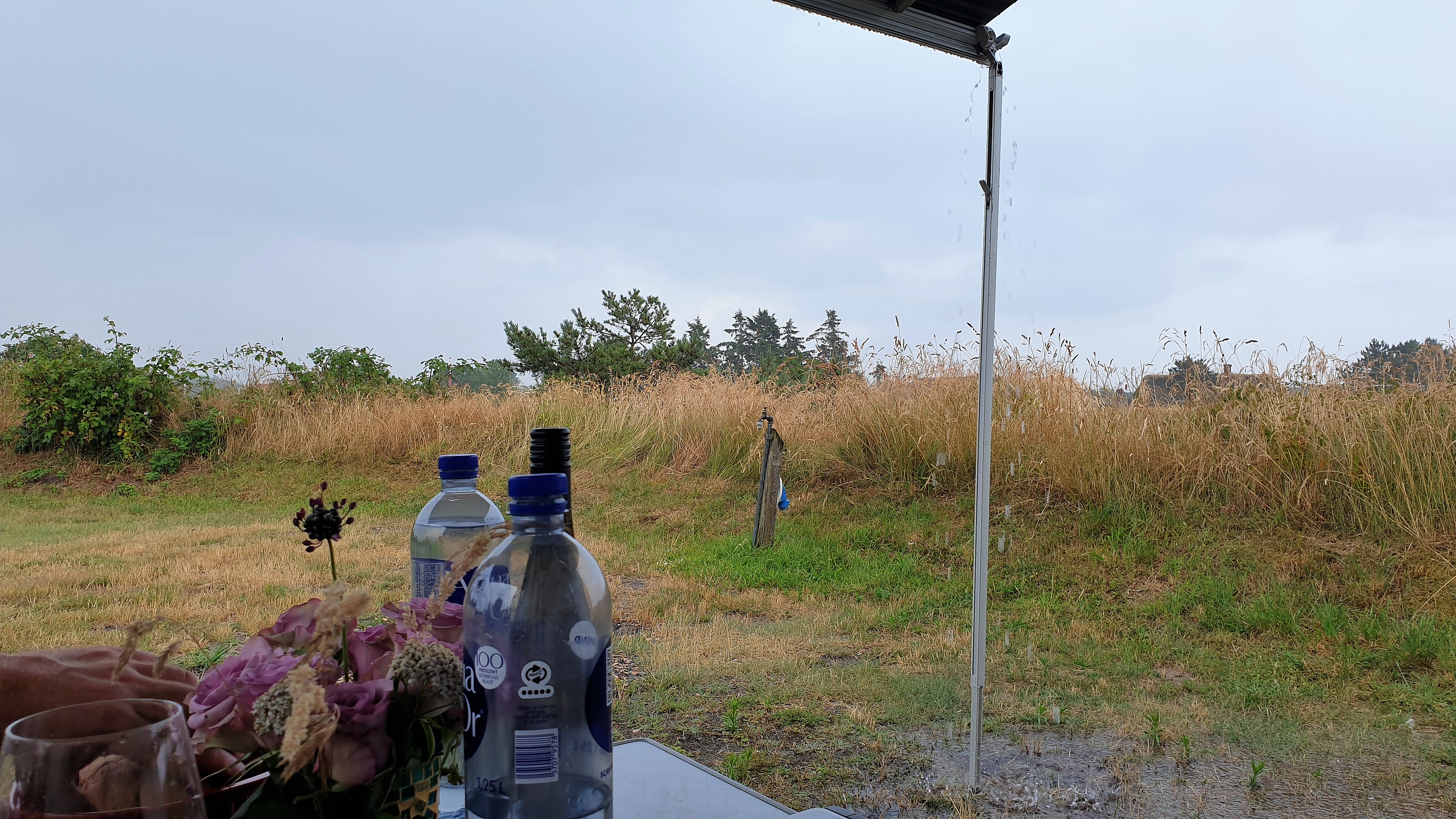 Fast wäre das ganze Vorhaben ins Wasser gefallen, denn bereits kurz vor Ralf’s Rückkehr aus dem Supermarkt beginnt es leicht zu regnen. Wir schaffen es gerade noch gemeinsam die Markise auszurollern und unsere Bänke ins Trockene zu heben und dann öffnen sich Wasserschleusen. Ein Wolkenbruch geht für etwa 45 Minuten nieder.