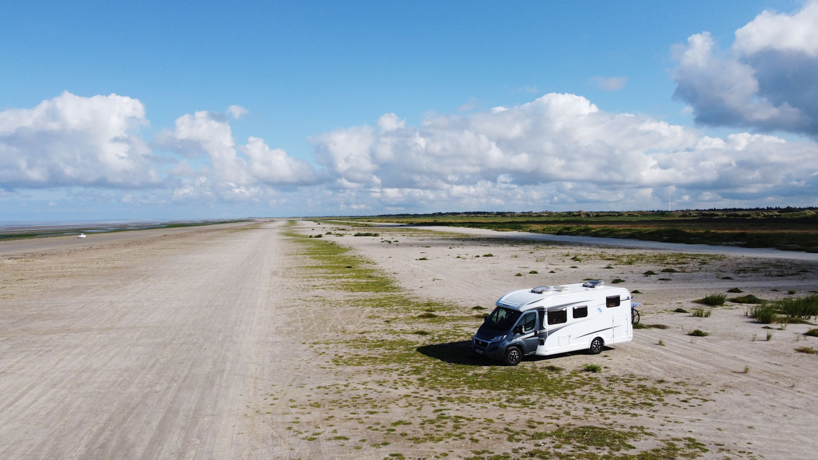 Direkt nach dem Hochwasser um 18 Uhr verlassen wir unseren Parkplatz und kurze Zeit später parken wir vor einer dunklen Wolkenwand auf unserem Platz auf dem Camping Klitten in Sönderho.