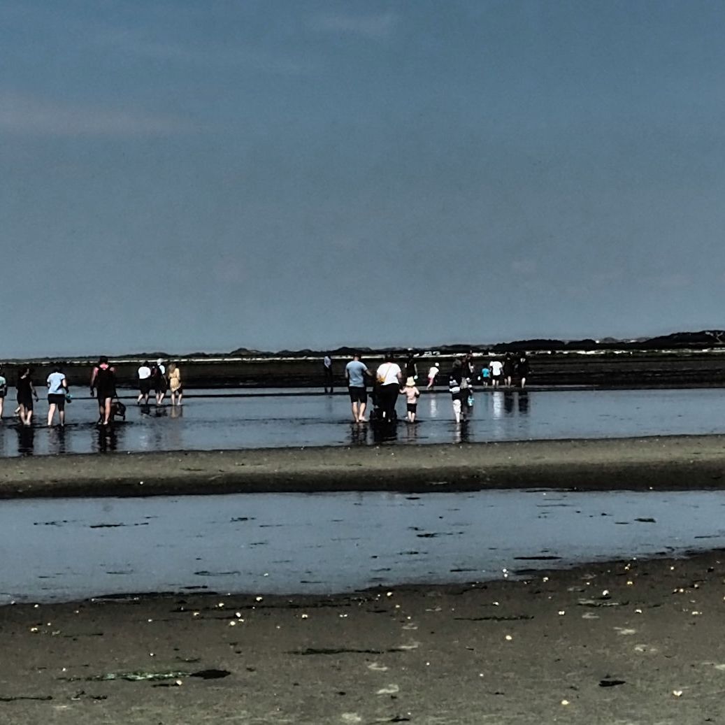 Heute ist Helen unser Guide. Ausgerüstet mit einer Wattgabel und Eimern für die Kinder bewegt sich unser Tross nach draußen, wo wir in etwa 1,5 km die Sandbank mit den Robben erreichen werden.