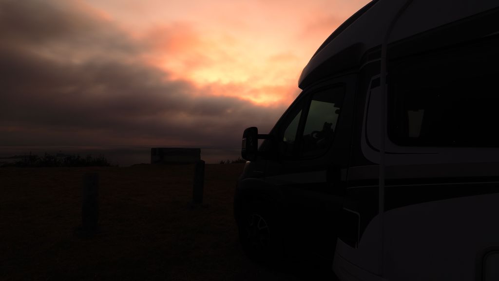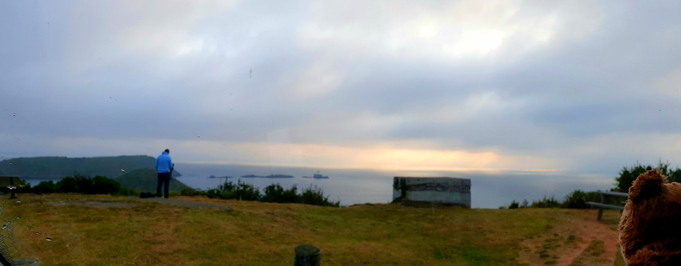Manchmal gibt es Dinge, die kann man einfach nicht erklären. Ob der fast nicht stattfindende Sonnenaufgang letztendlich die Richtung bestimmt. Wir wissen es nicht. Die Farben auf dem Meer sind zwar ganz schön, aber eigentlich haben wir uns doch mehr von den Sonnenauf- und Untergängen hier in der Bretagne versprochen. So auch heute Morgen an unserem ruhigen Übernachtungsplatz mit Aussicht.