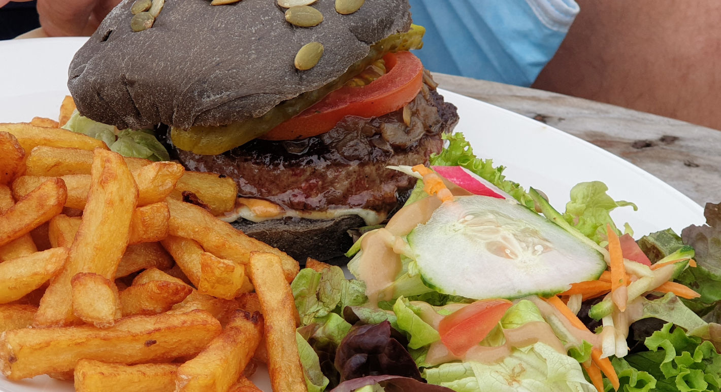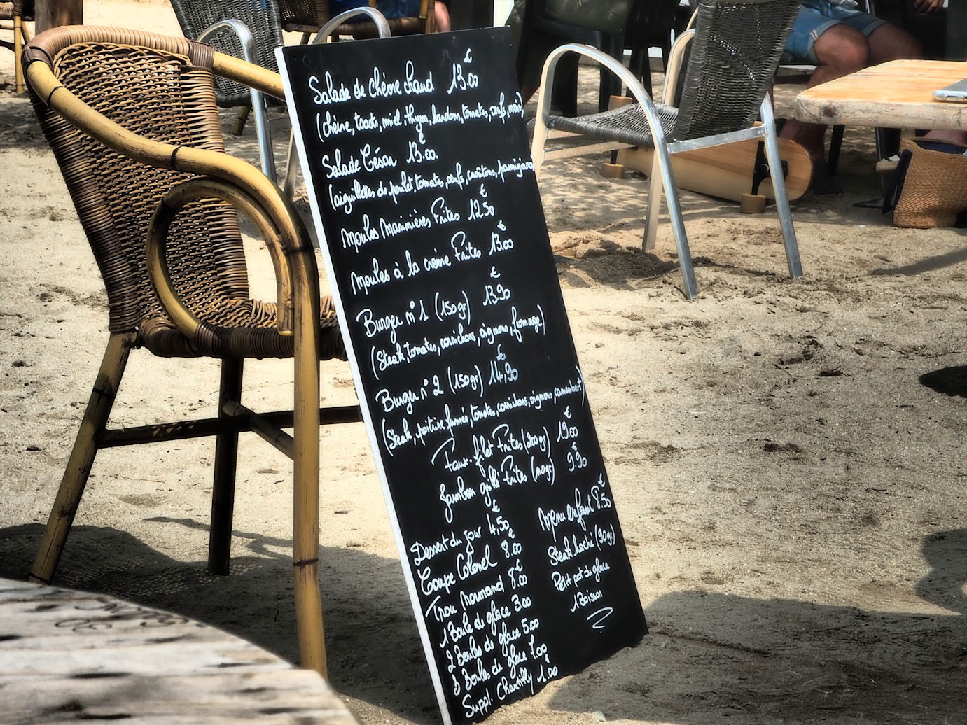 Unsere Mittagspause versüßt uns aber der Aufenthalt hier an diesem Ort. Eine kleine Strandbutze mit ein paar Gerichten auf der handgeschriebenen Karte ist unser Ziel. Es gibt wieder mal Moules mit Pommes Frites für Ulli und Ralf erfreut sich eines Burgers. Alles sehr frisch und sehr lecker und der Weißwein passt herrlich…Während des Essens zeigt sich auch etwas die Sonne, irgendwie angemessen für ein Abschiedsessen, oder?