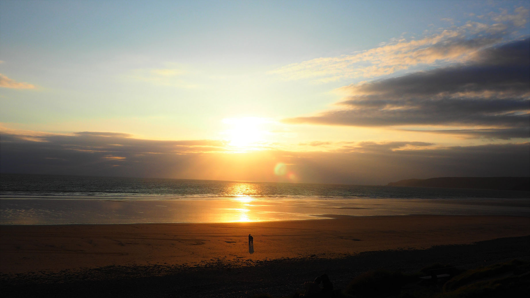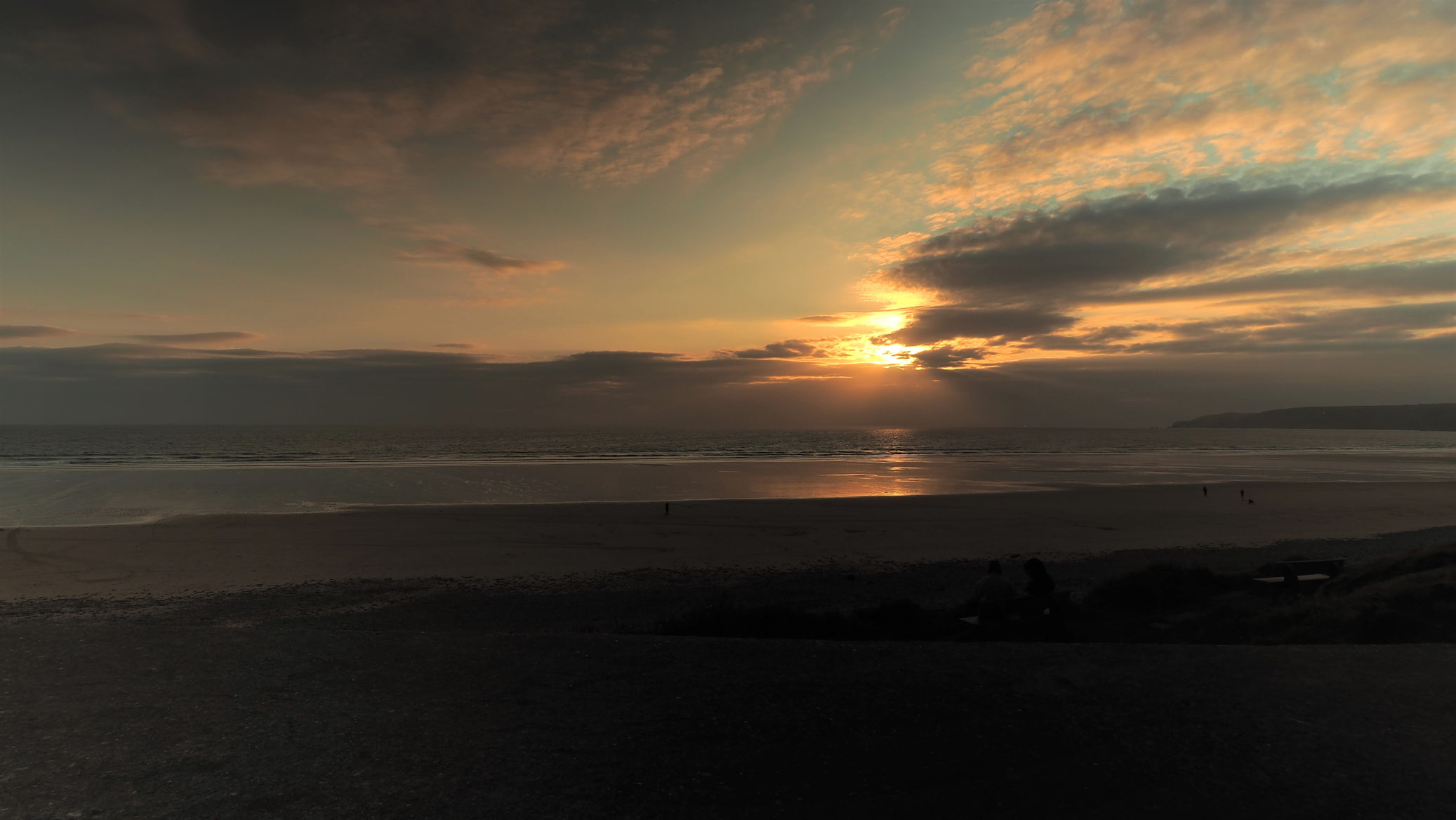 Als wir gegen 18 Uhr zum Womo zurückkommen, hat es die Sonne immer noch nicht geschafft. Ein bisschen traurig darüber starten wir trotzdem kurze Zeit später unseren lang ersehnten Strandspaziergang mit zwei völlig außer Rand und Band herumspringenden Fellnasen. Belohnt wird die Hüpferei der beiden mit „Sonnenschein“, der diesen Traumstrand in ein irres Licht hüllt…