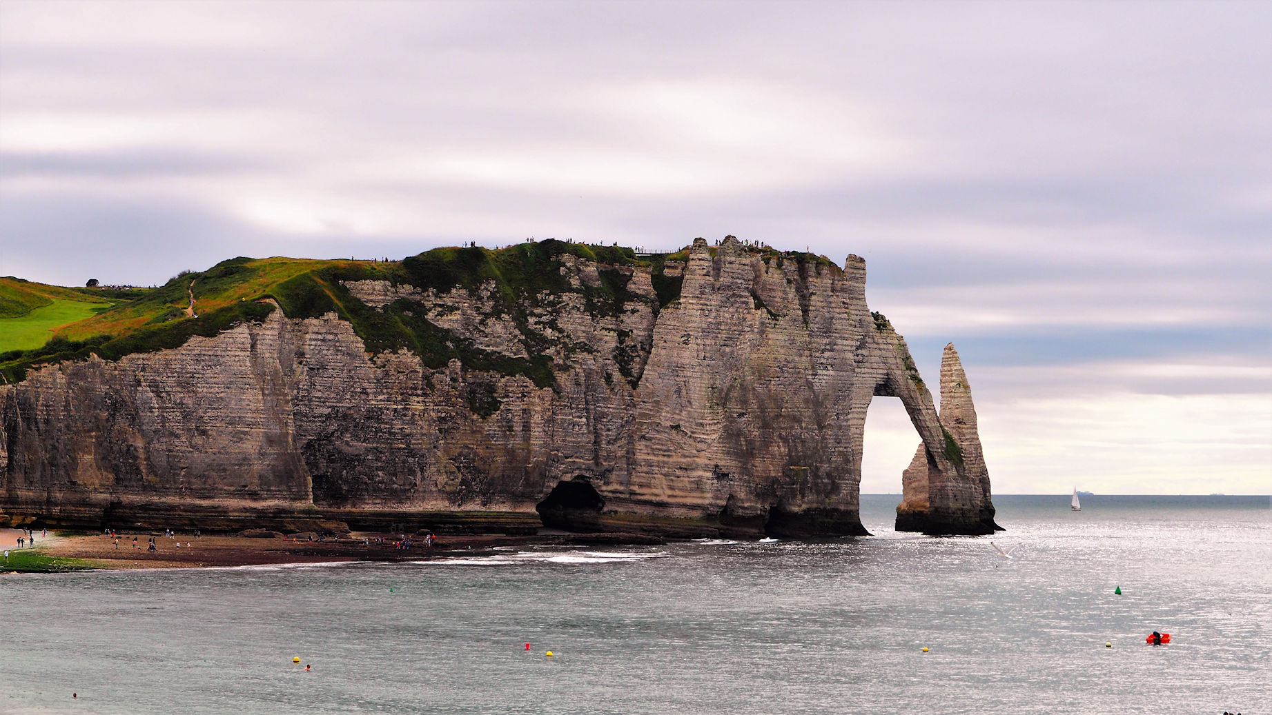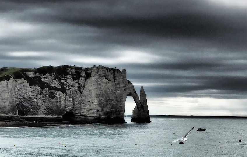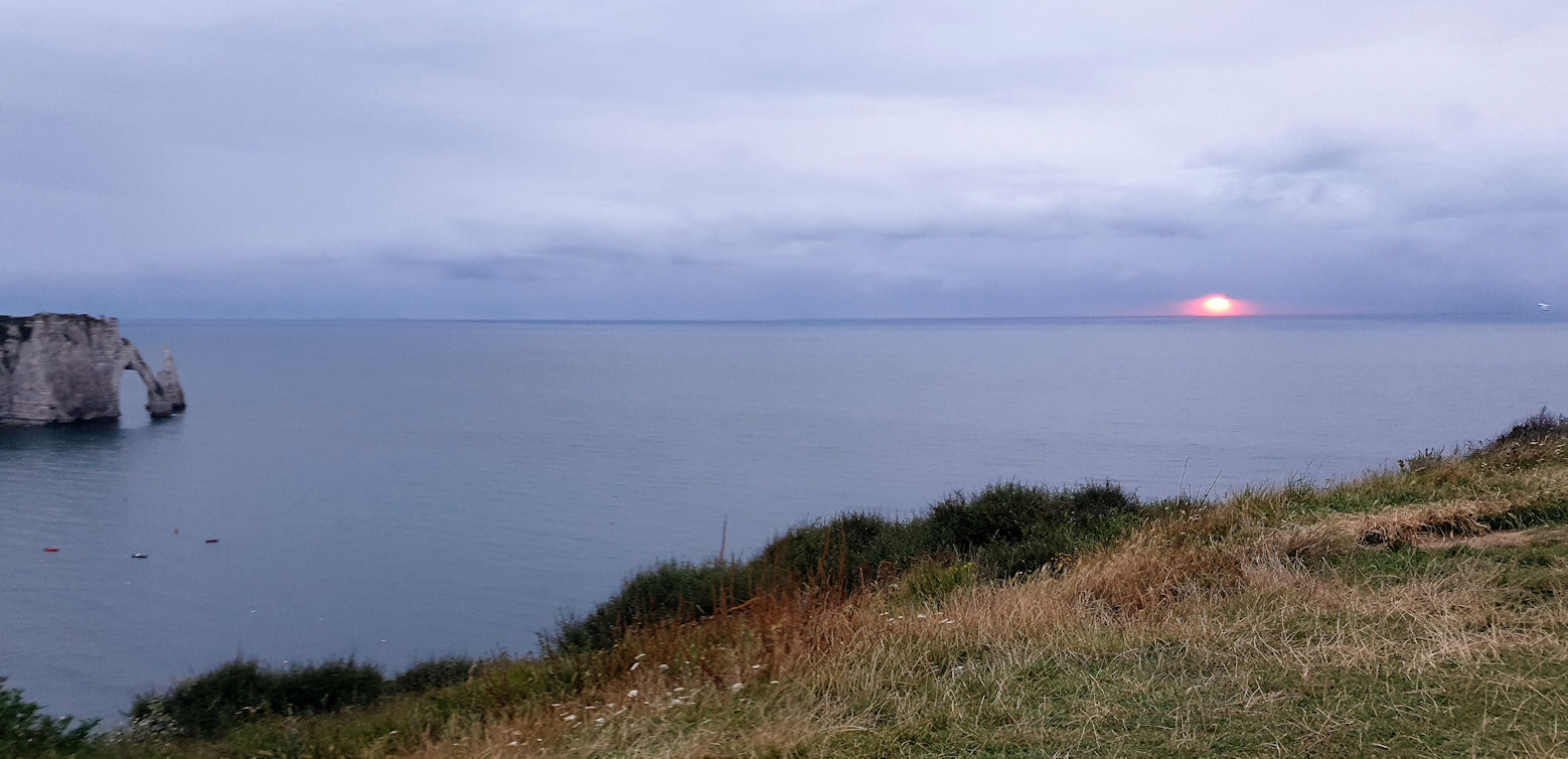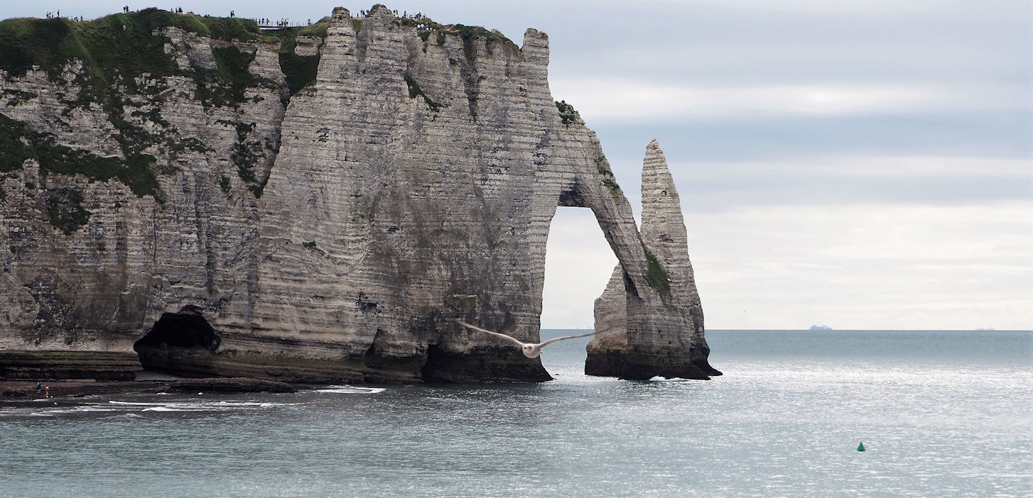 Wir nutzen die Mittagszeit, um wegen Ulli’s Weizenunverträglichkeit 2 Baguettes aus Dinkelmehl zu backen und verlassen erst gegen 15 Uhr zu Fuß den Campingplatz in den überfüllten Ort Étretat. Die Sonne scheint und das auflaufende Wasser beschert uns etwas „Meer“ unter dem Torbogen. Es ist wirklich total voll, aber die Felsen sind auch wirklich schön. Dass aber zwei Löcher im Fels einen solchen Hype auf Menschen auslösen können, ist schon ein wenig verwunderlich.