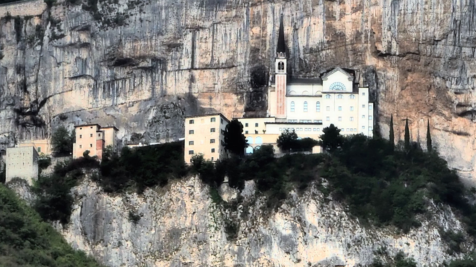 Um 8 Uhr sind wir wieder am Stellplatz und weiter geht es über den Kalterer See zur Autobahn. Unsere Strecke führt uns vorbei an der Region des Gardasees – hier kann man von der Autobahn das förmlich an den Felsen geheftete Kloster Madonna della Corona sehen.