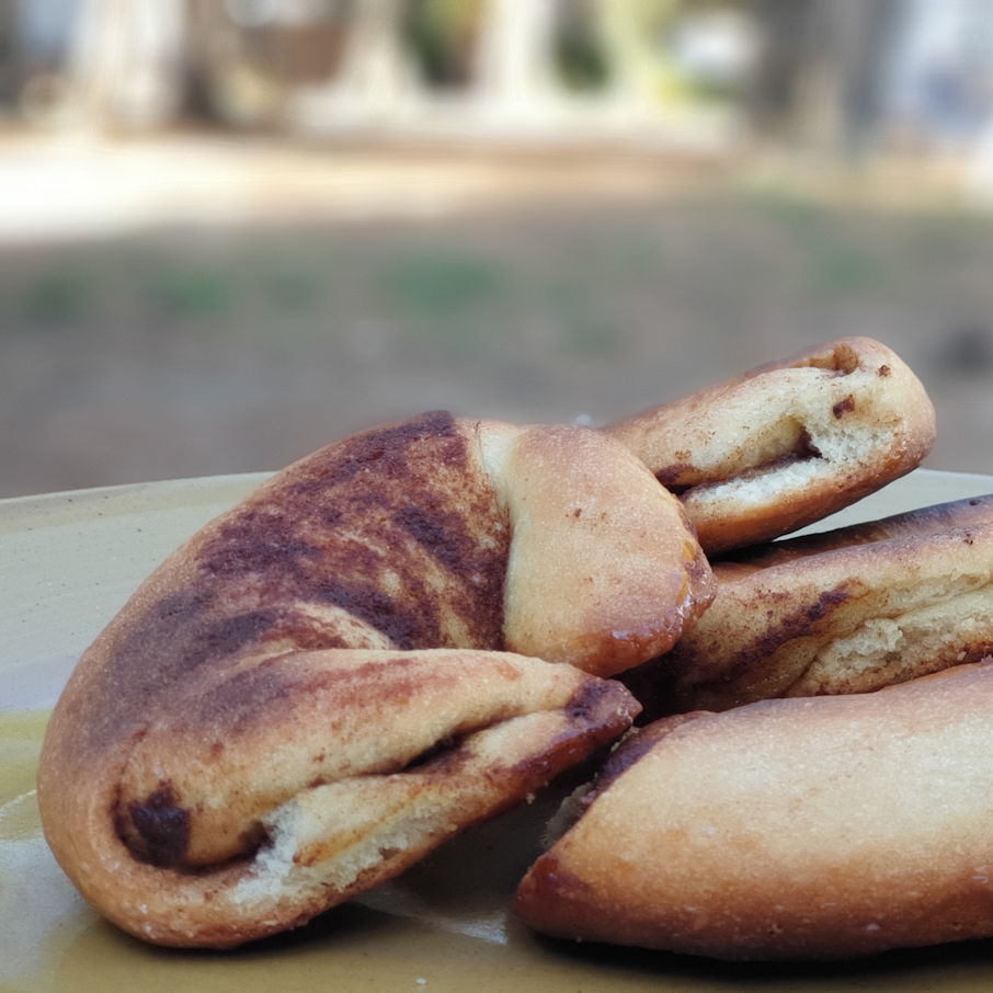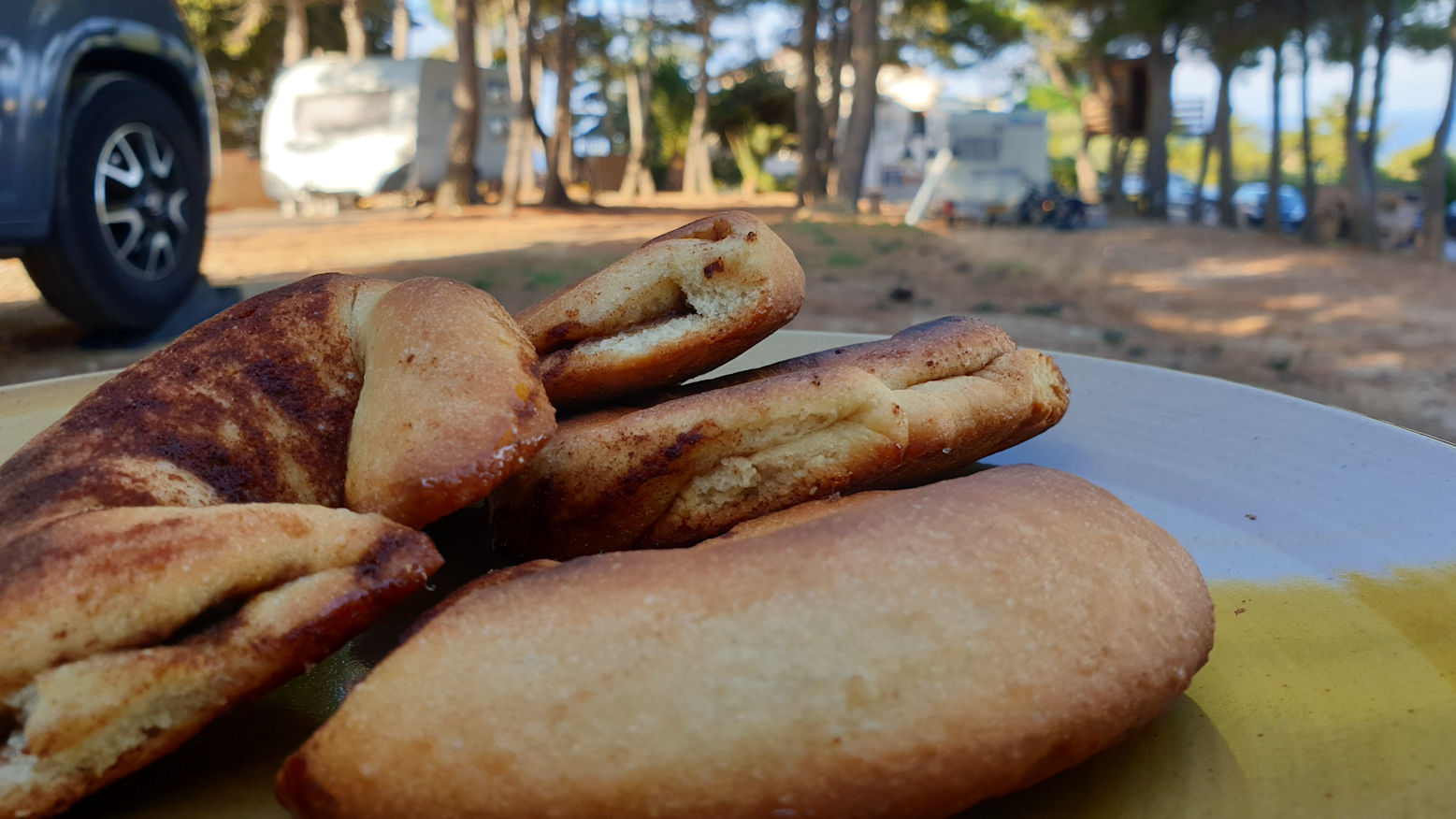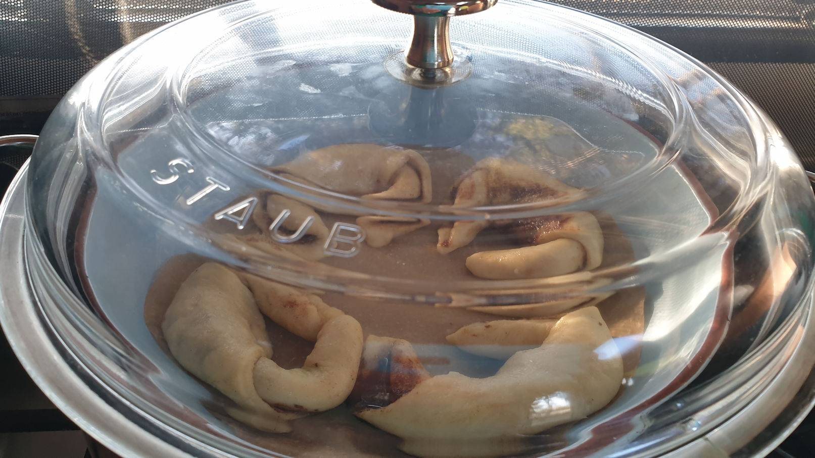 Die Hörnchen werden aus Hefeteig hergestellt, mit leckerer Zimtfüllung versehen und schon befinden sie sich im Topf zum Backen. Schade, dass Ihr den Zimtduft nicht riechen könnt…echt lecker und so schmecken sie dann auch bei unserem Frühstück vorm Womo so gegen halb 10.