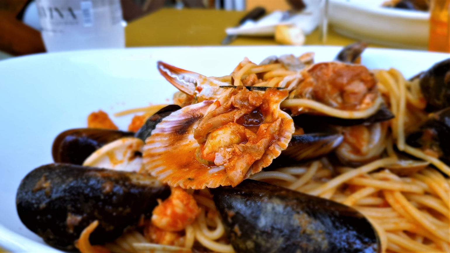 Wir entscheiden uns für Spaghetti allo Scoglio (mit Meeresfrüchten) für Ralf, eine große Portion Cozze (Miesmuscheln) für Ulli und anschließend zweimal das Fritto Misto (gemischtes frittiertes Meeresgetier)