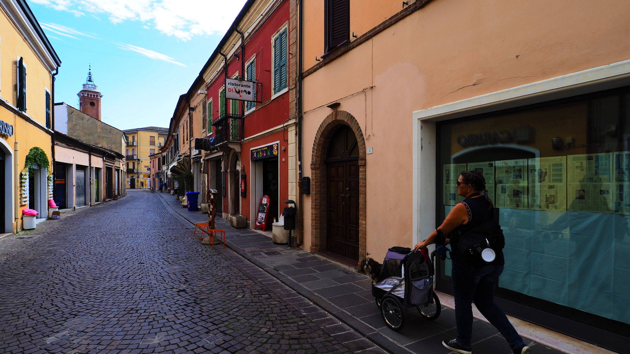 Das Wetter ist toll. Es hat etwa 25 Grad und Sonne und Wolken wechseln sich ab. Auch die Fellzwerge haben Spaß am Laufen, obwohl wir der Stadt wegen wieder deren „Carrozzina“ mitgenommen haben.