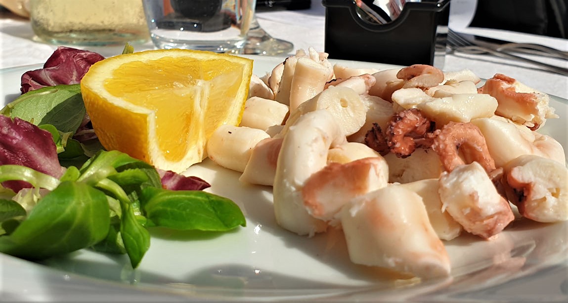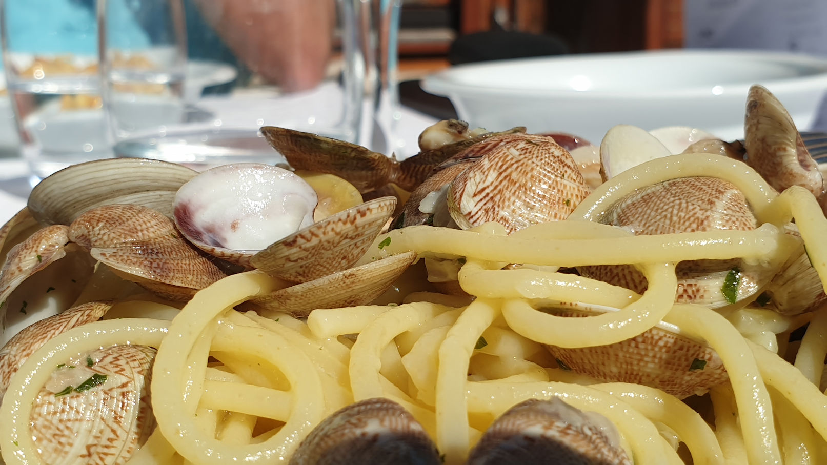 Das Restaurant, das wir uns ausgesucht hatten, hat leider geschlossen und so landen wir nahe an unserem Stellplatz, direkt am Fischereihafen in der Trattoria da Momolo. Vergessen wir mal den leicht verpeilten Kellner, so ist es echt nett. Wir haben einen Platz in der Sonne und was isst man wohl an solch einem Ort mit hunderten von Fischerbooten vor der Nase? Antipasti aus dem Meer, Primi aus dem Meer und man soll’s kaum glauben: auch der Hauptgang kommt aus dem Meer!
