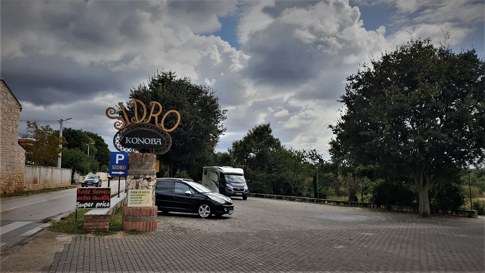 In Höhe Palmanova erleben wir dann einen sintflutartigen Regenschauer bis ungefähr nach Triest. Durch Slowenien wechseln sich Sonne und Wolken ab und kaum in Istrien angekommen beginnt es wieder zu regnen. Und das genau bis etwa 5 km vor unserer Abfahrt nach Vrsar. Entlang des Schweineäquators (hier gibt es einige Konobas/ Spanferkelgrills) schlängeln wir uns bis nach Flengi unserem anvisierten Ziel für unsere Mitttagspause zur Konoba „Sidro“…