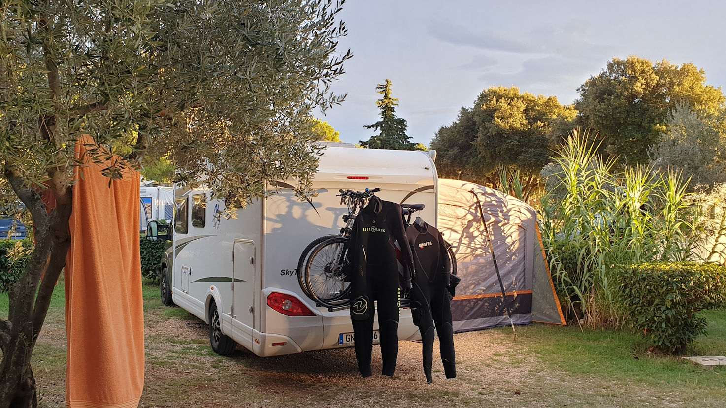 Ulli geht mit dem festen Vorsatz zur Rezeption, den Campingplatz und Kroatien heute zu verlassen. Schweren Herzens, denn uns allen vieren gefällt es eigentlich hier. Die nette Angestellte der Rezeption scheint das zu merken und bietet Ulli Platz 44a an. Nach einer kurzen Begutachtung dieses Platzes steht fest: wir bleiben!!!