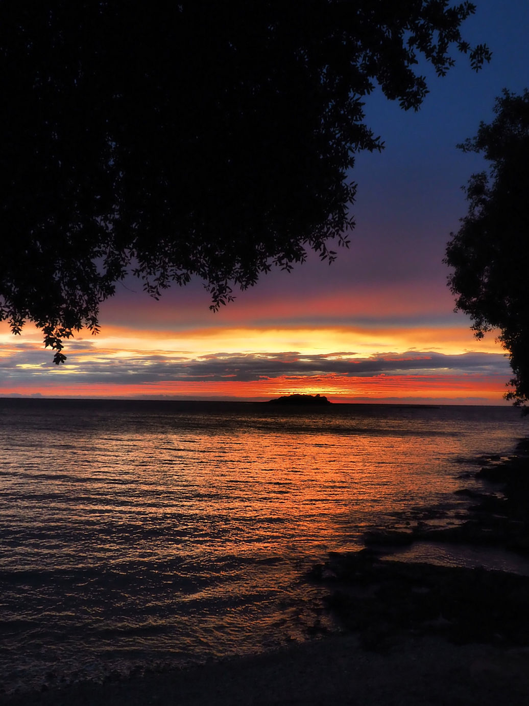 Ein Traumsonnenuntergang in Karibikfarben…Nun sitzen wir im Vorzelt und Regen prasselt auf’s Dach, denn noch während des Sonnenuntergangs beginnt es zu regnen….wir schreiben und suchen Fotos für Euch aus…in einer wundervollen Ruhe…