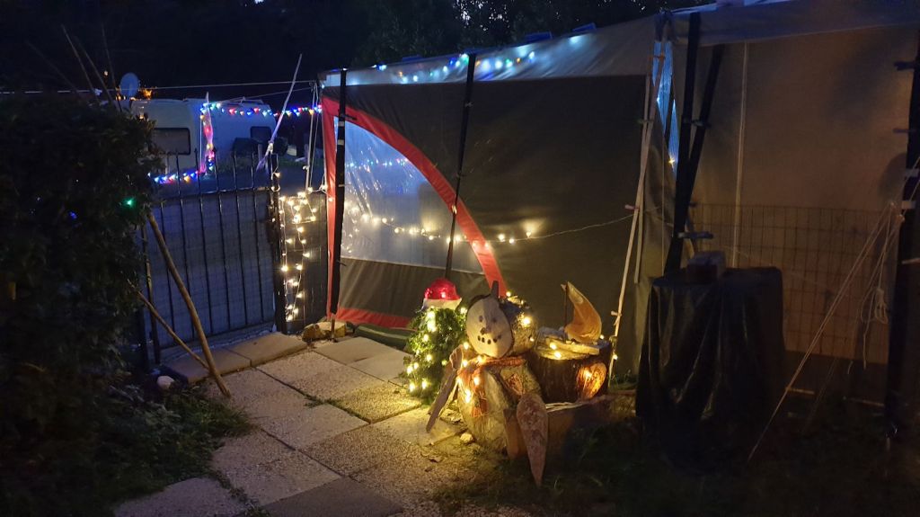 Etwas durchgefroren lassen wir uns in der Bar am Strand nieder und genießen den Sonnenuntergang bei einem Dekobier. Bei unserem Weg zurück über den Camping passieren wir dann noch ein weihnachtlich dekoriertes Zelt im Bereich der Dauercamper. Hier das Beweisfoto! Mit Schneemann und Lichtern!!