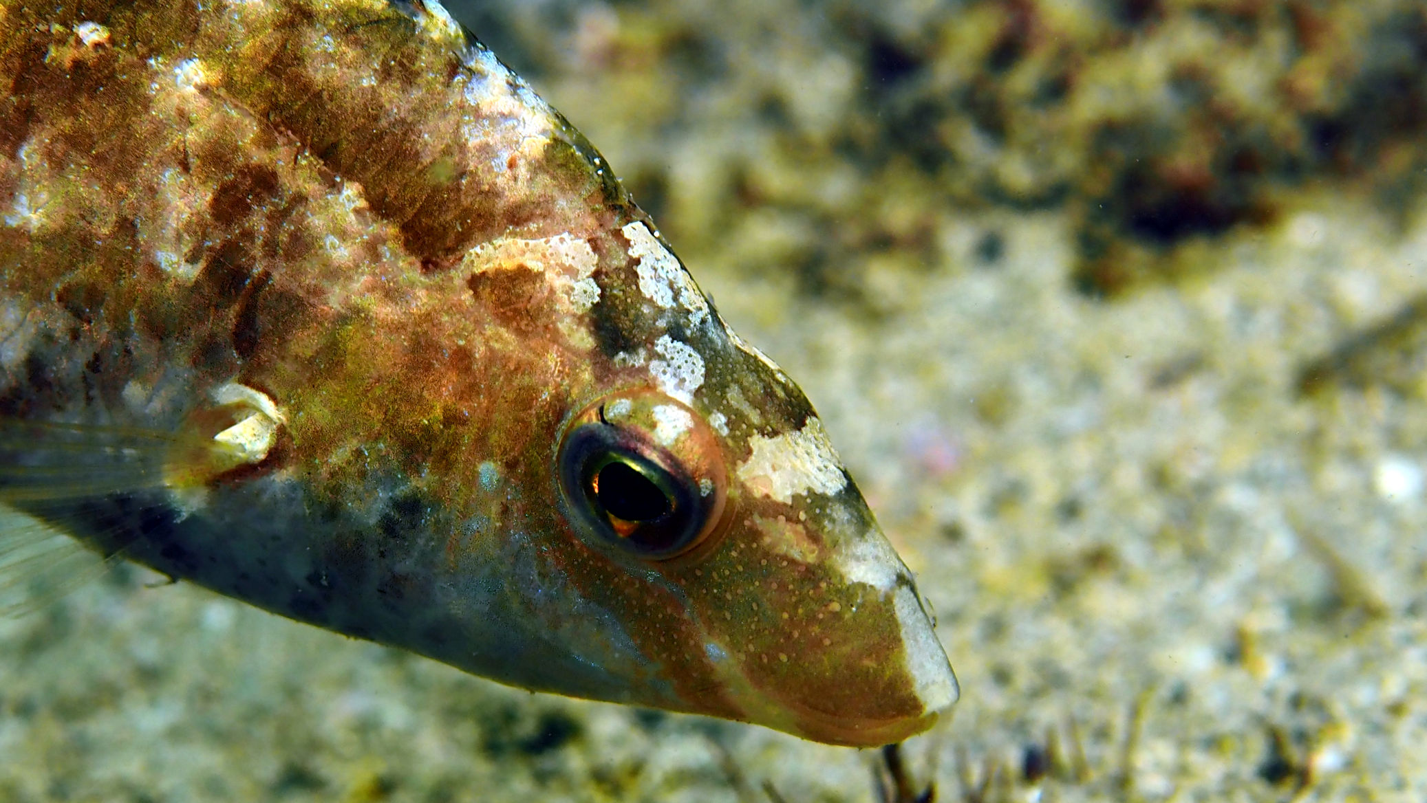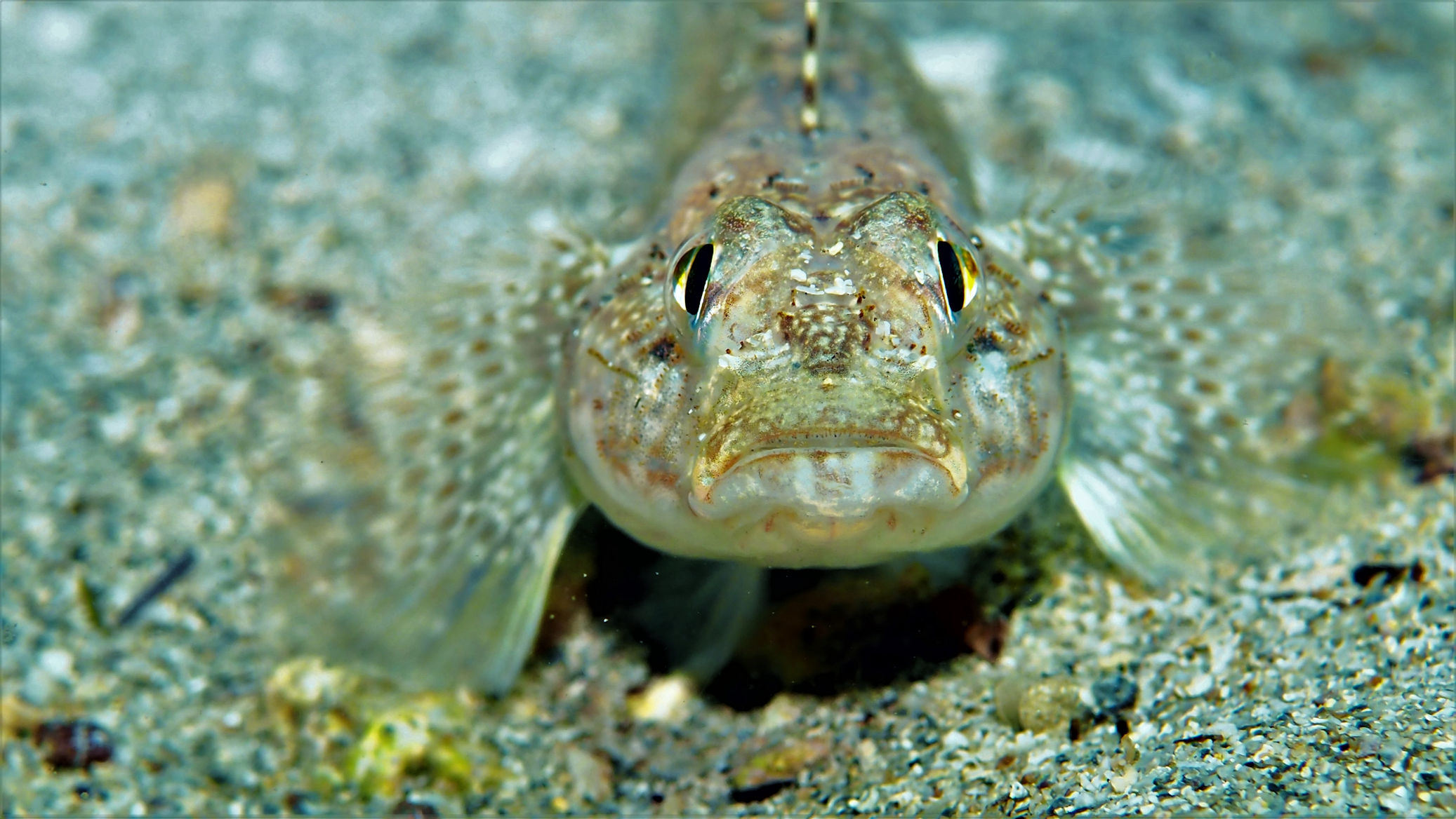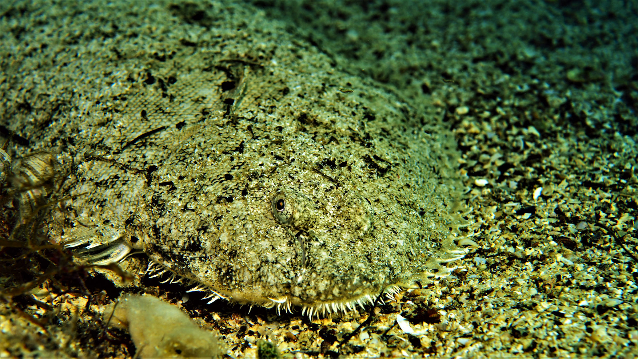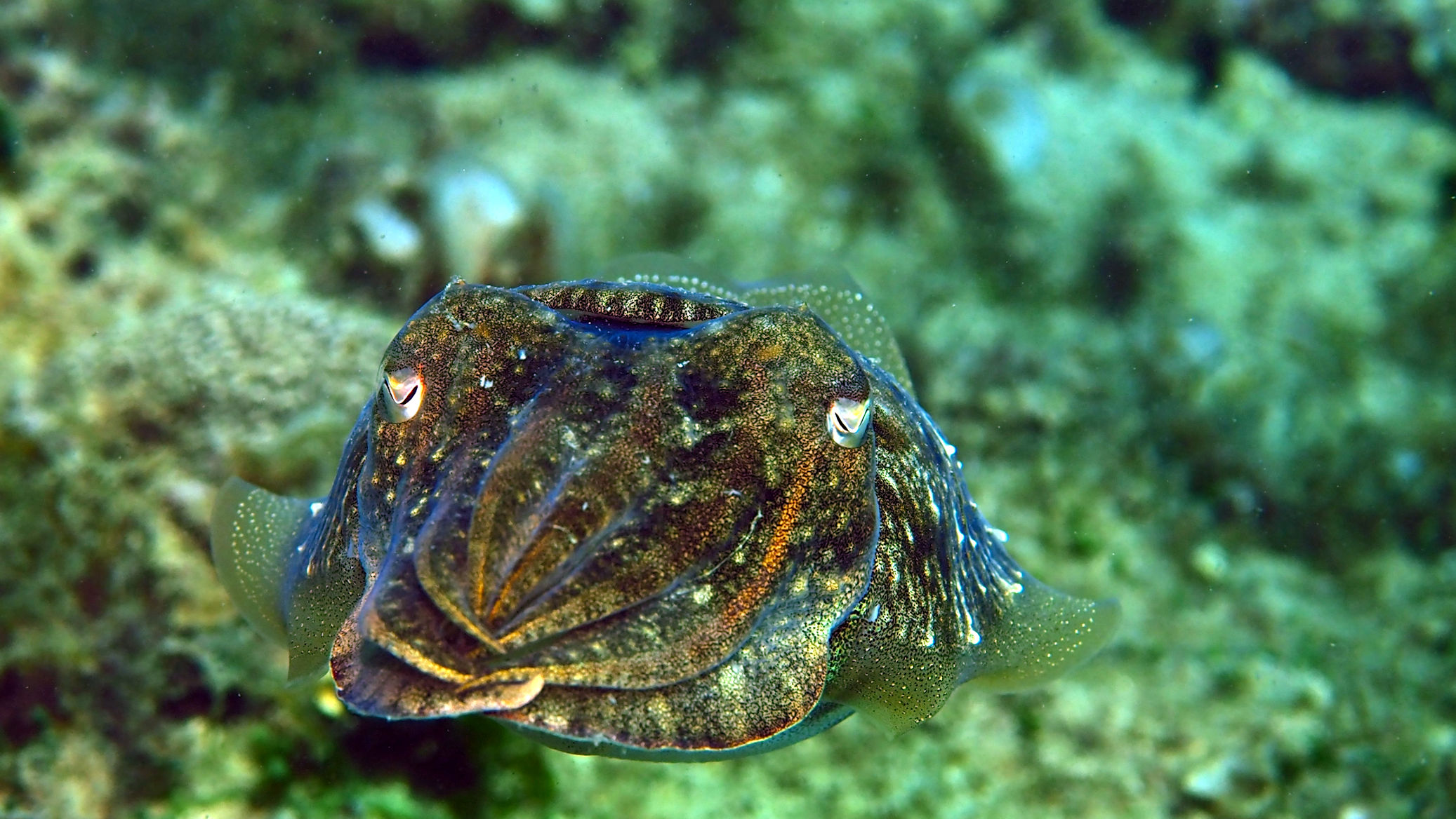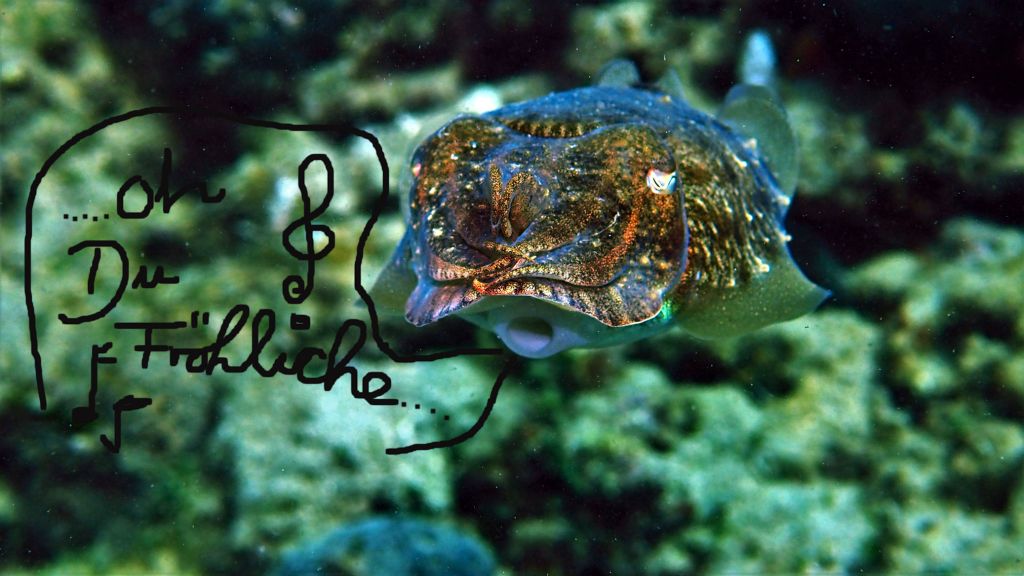 Kurze Zeit später sind wir unter der Wasseroberfläche. Eine Sepiabegegnung gepaart mit einen Schnappschuss hält das Thema Weihnachten aufrecht, denn es sieht so aus, als würde die Sepia “ Oh, Du Fröhliche“ singen. Natürlich entstehen weitere schöne Fotos. Viel Spaß damit!
