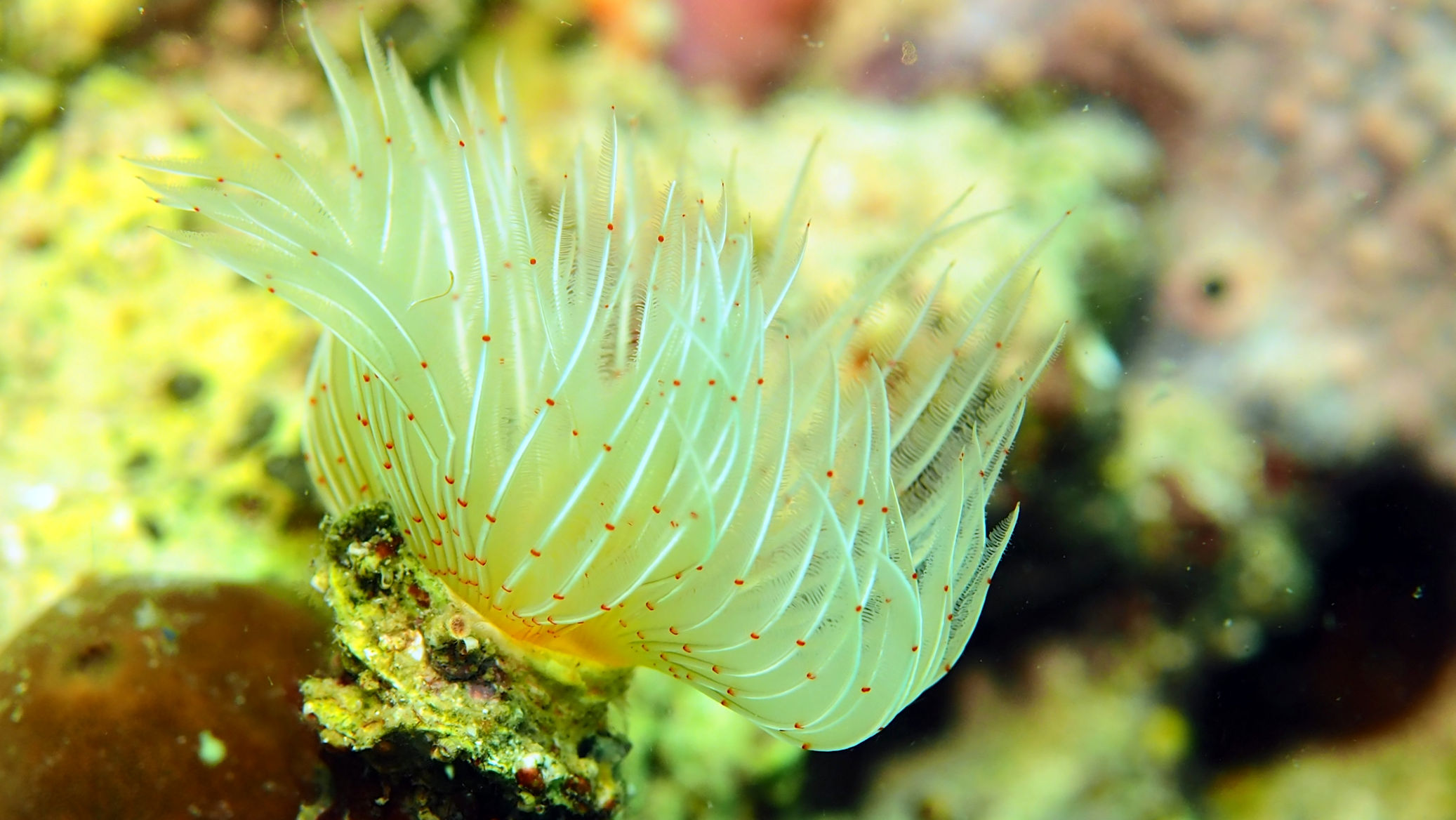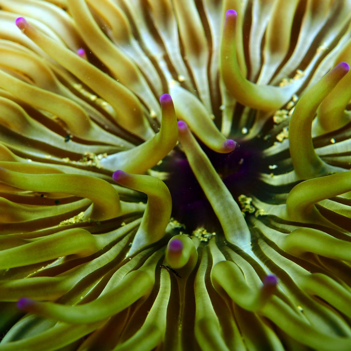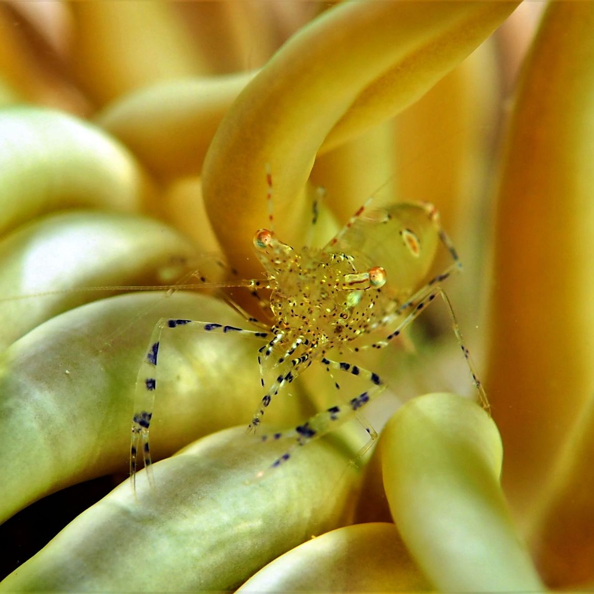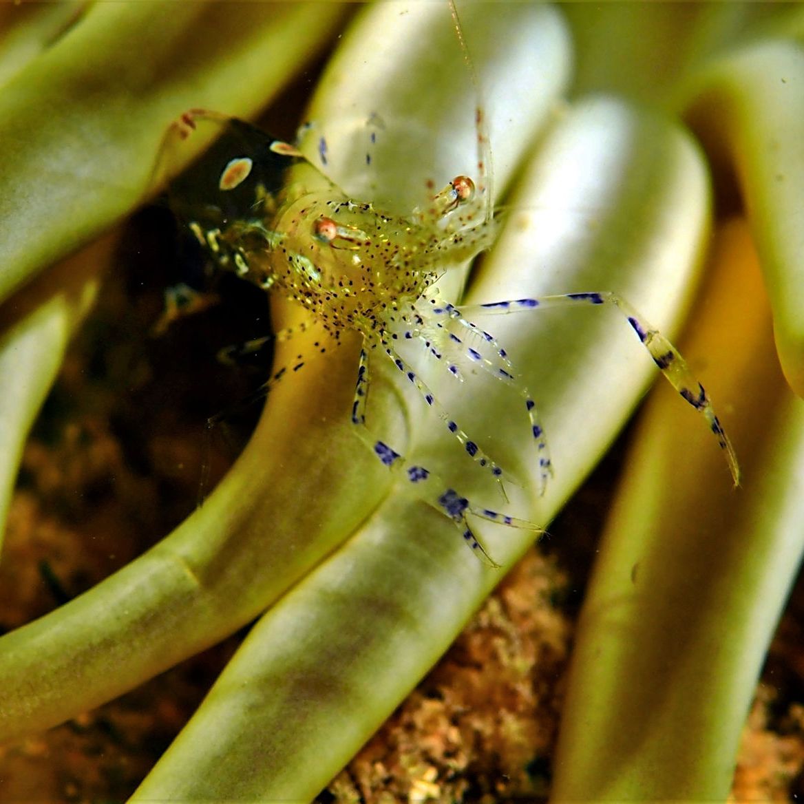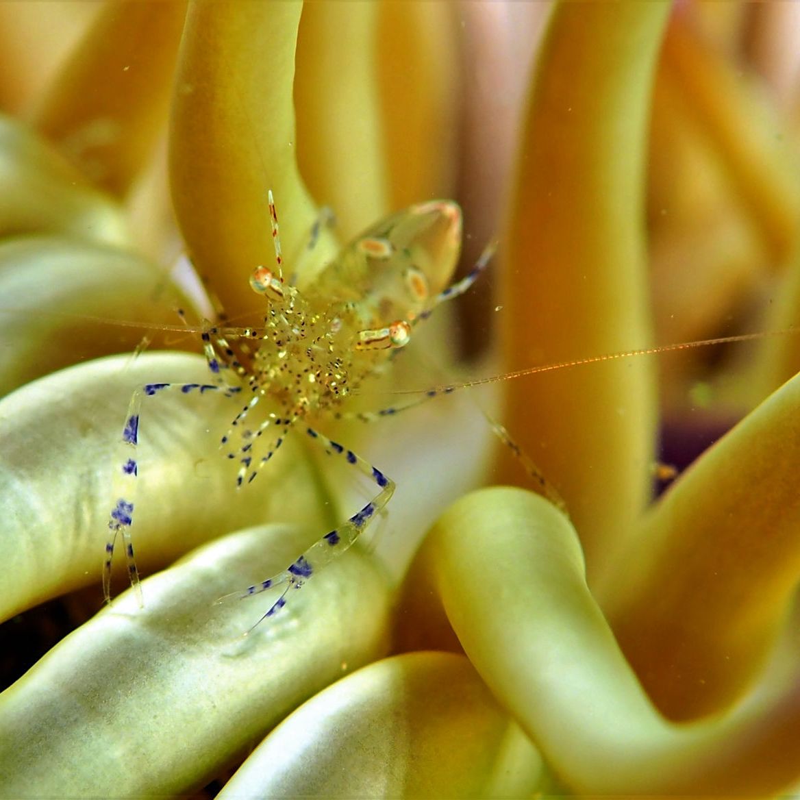 Auch im Mittelmeer gibt es Anemonen. Hier in der Bucht die sogenannten Sandgoldrosen. In diesen wundervollen Tieren leben oft Amethyst-Partnergarnelen. Und genau solch eine Garnele haben wir heute gesucht. Und jetzt kommt wieder die Verbindung zu Weihnachten: erst in der 24. Anemone, also total „adventskalenderlike“, wohnt tatsächlich eins dieser Tiere….Winzig klein, filigran, wunderschön….