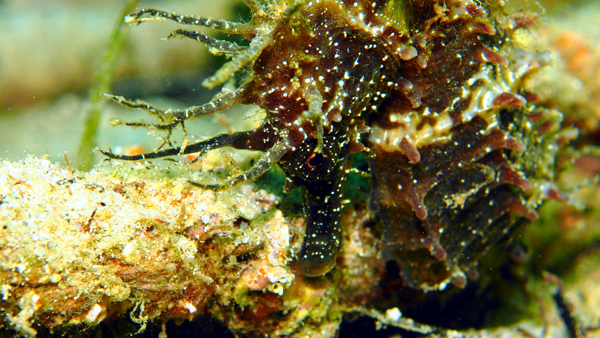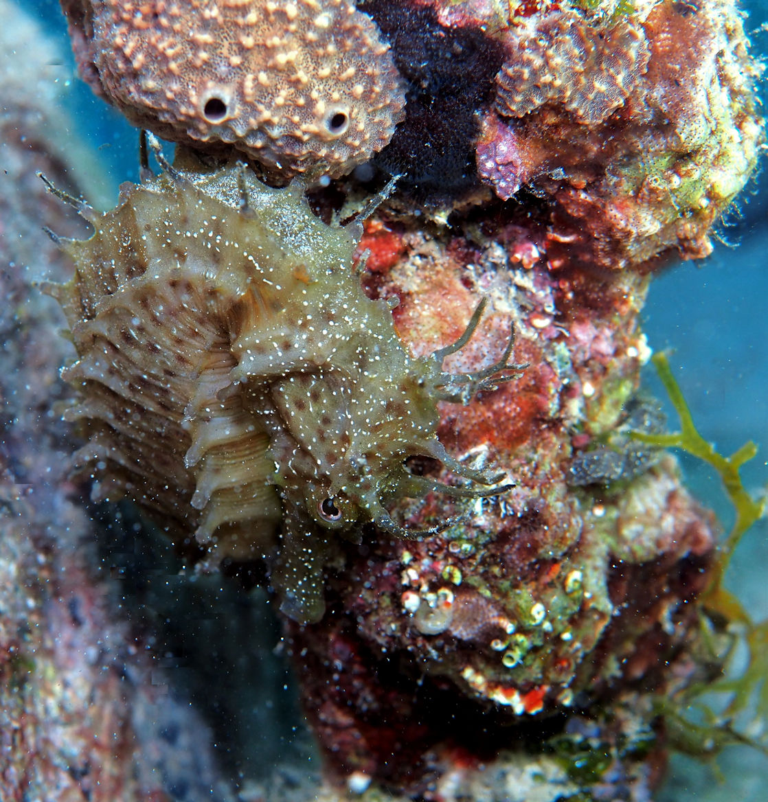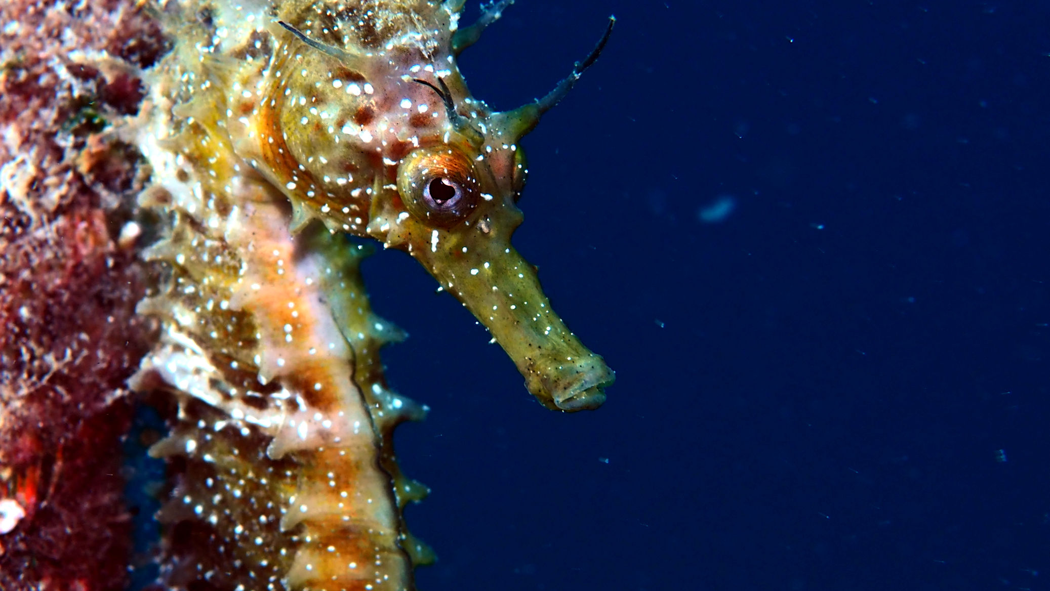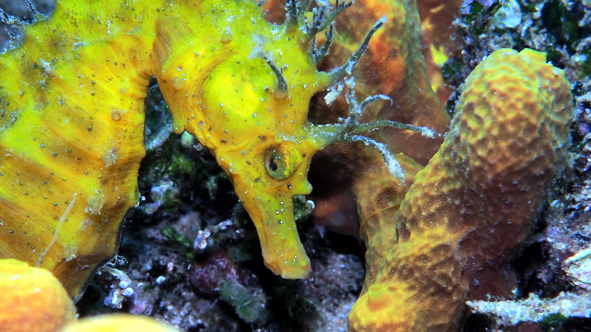 Auch begegnet uns ein großer Schwammträger,eine winzige Fadenschnecke und zum Abschluss, als die Sonne dem Riff für etwa eine Minute eine Zauberstimmung verleiht, die Farbe gelb in Form eines sehr großen, quietschgelben Seepferds. Die Sonne hingegen hat sich in der Zwischenzeit wieder in den Wolken verkrochen.