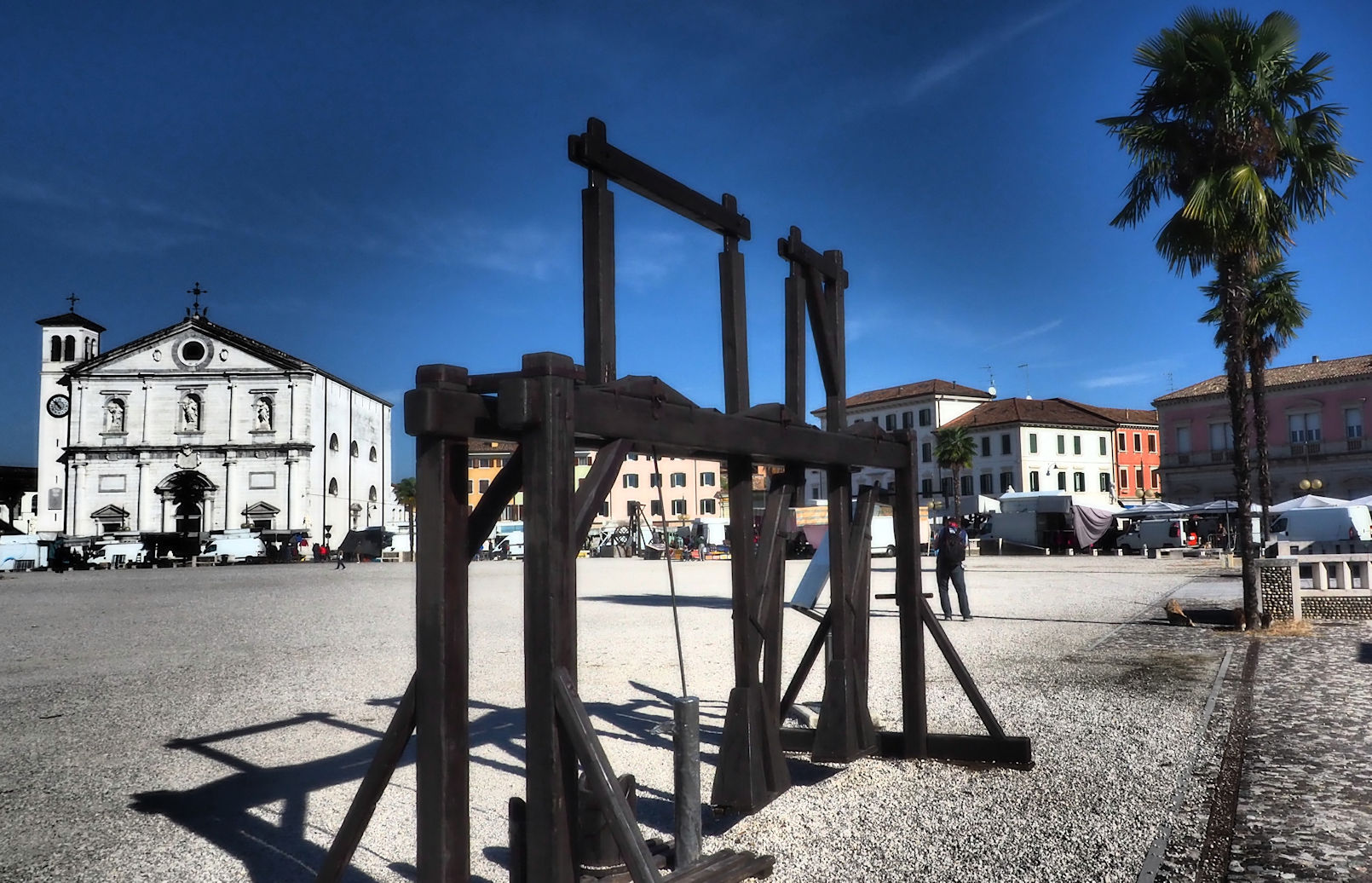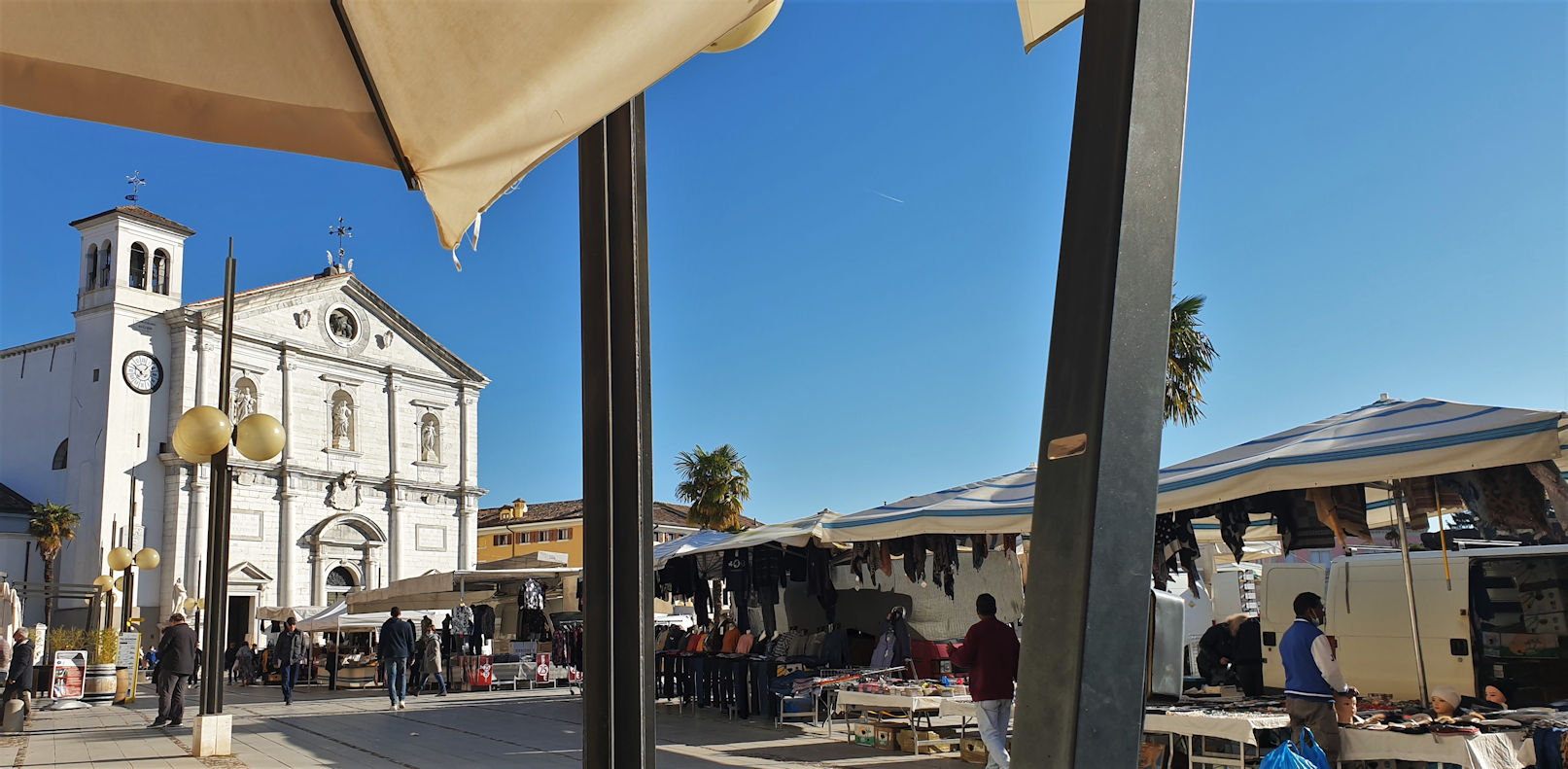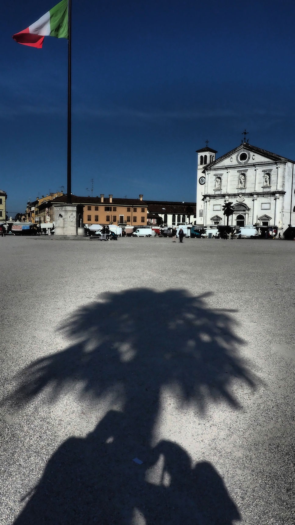 Schnell sind wir alle gassibereit und es geht los in Richtung Piazza. Es ist noch vor neun und es ist Sonntag. Und es ist Wochenmarkt auf der riesigen Piazza. Wir genießen die Atmosphäre und entscheiden uns für die Sonnenseite der Piazza. Es folgt Cappuccino und Brioche. Und dann ist Leute beobachten angesagt. Auch kümmern wir uns um den weiteren Verlauf unserer Heimfahrt und es fällt uns nichts Besseres ein, als noch einmal nach Süden abzubiegen.