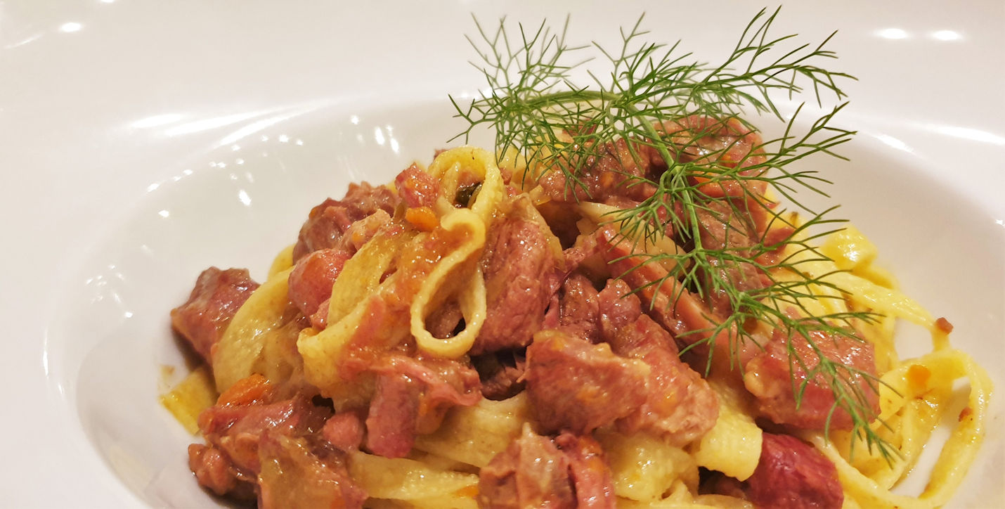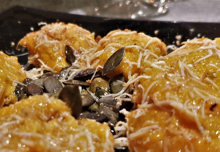 Der letzte Abend-Blues startet mit einer Ribolla Gialla – einem überaus leckeren Perlwein. Es folgen Tagliatelle con Anatra, Risotto Gorgonzola Castagne, Crema di Fagioli und Gnocchi con Zucca.