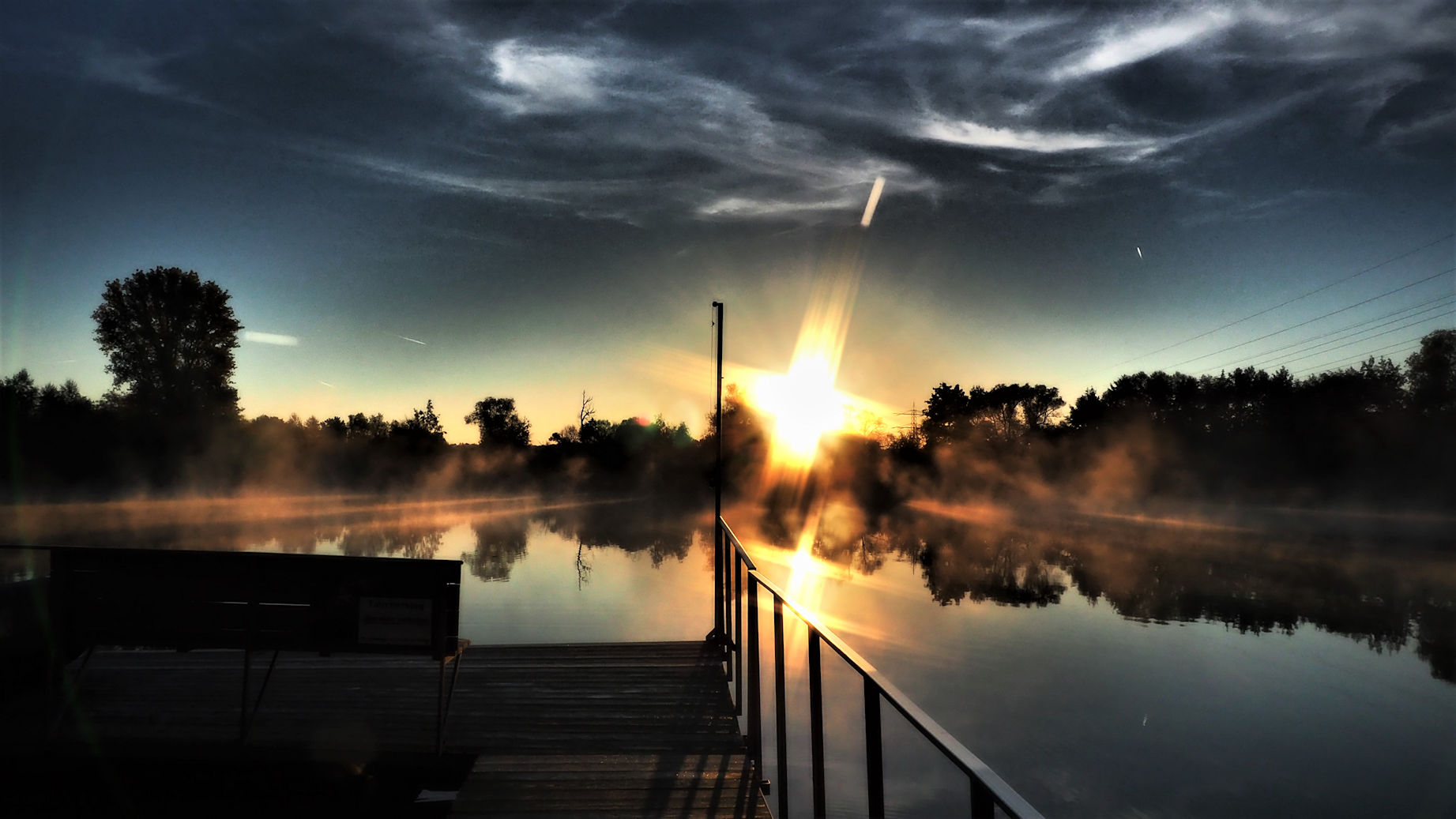 Der erste Blick aus der Dachluke verrät: es ist richtig kalt, denn es hat sich eine Eisschicht auf der Luke gebildet. Um etwa halb neun klettert die Sonne über die Bäume und beleuchtet den leicht vernebelten See ganz wundervoll. Die perfekte Fotozeit…