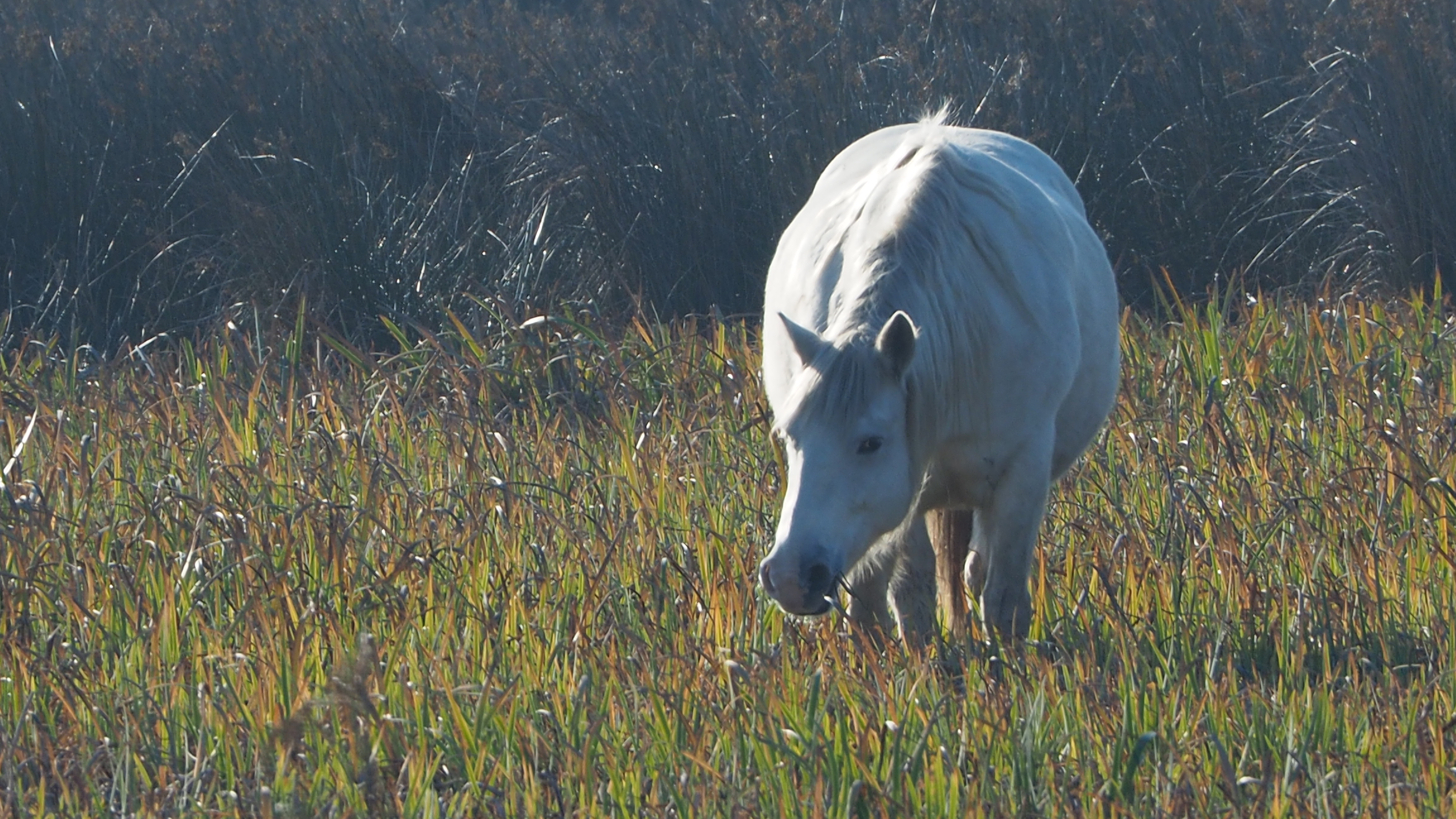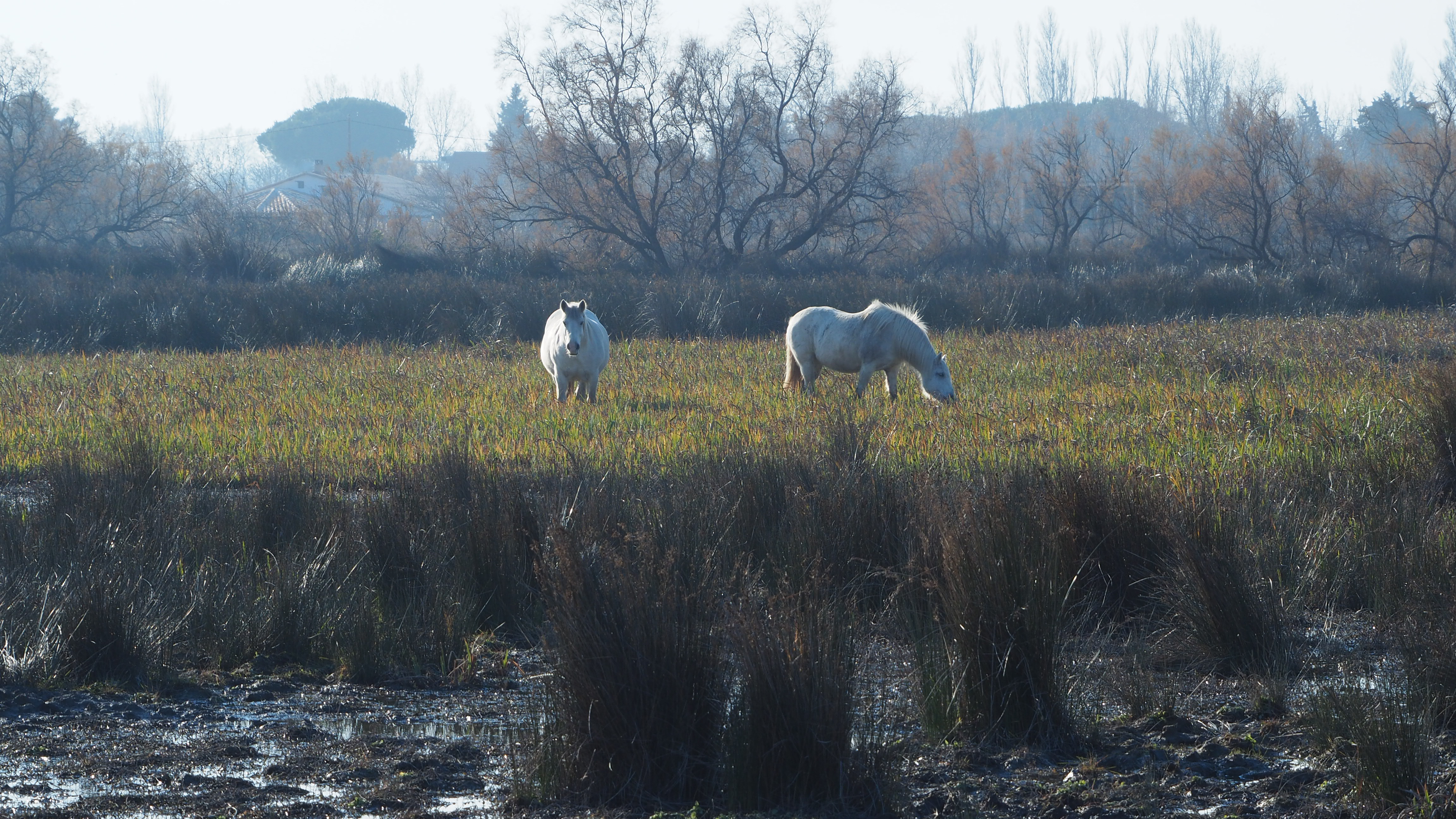 Gegen 10 Uhr geht es los. Das Ziel heißt Saintes-Marie-de-la-Mer, die angeblich heimliche Hauptstadt der Camargue. Das Licht ist hell und passend zu den Temperaturen kühl. Ab und an passieren wir ein paar weiße Pferde oder Stiere, die am Straßenrand stehen. Überall wächst Schilf und der ein oder andere Reiher zeigt sich ganz nah. Und dann fliegen direkt vor uns 4 Flamingos in ihrer ganzen Schönheit über die Straße…aber leider geht das alles zu schnell für ein gutes Foto.