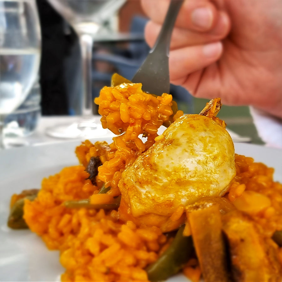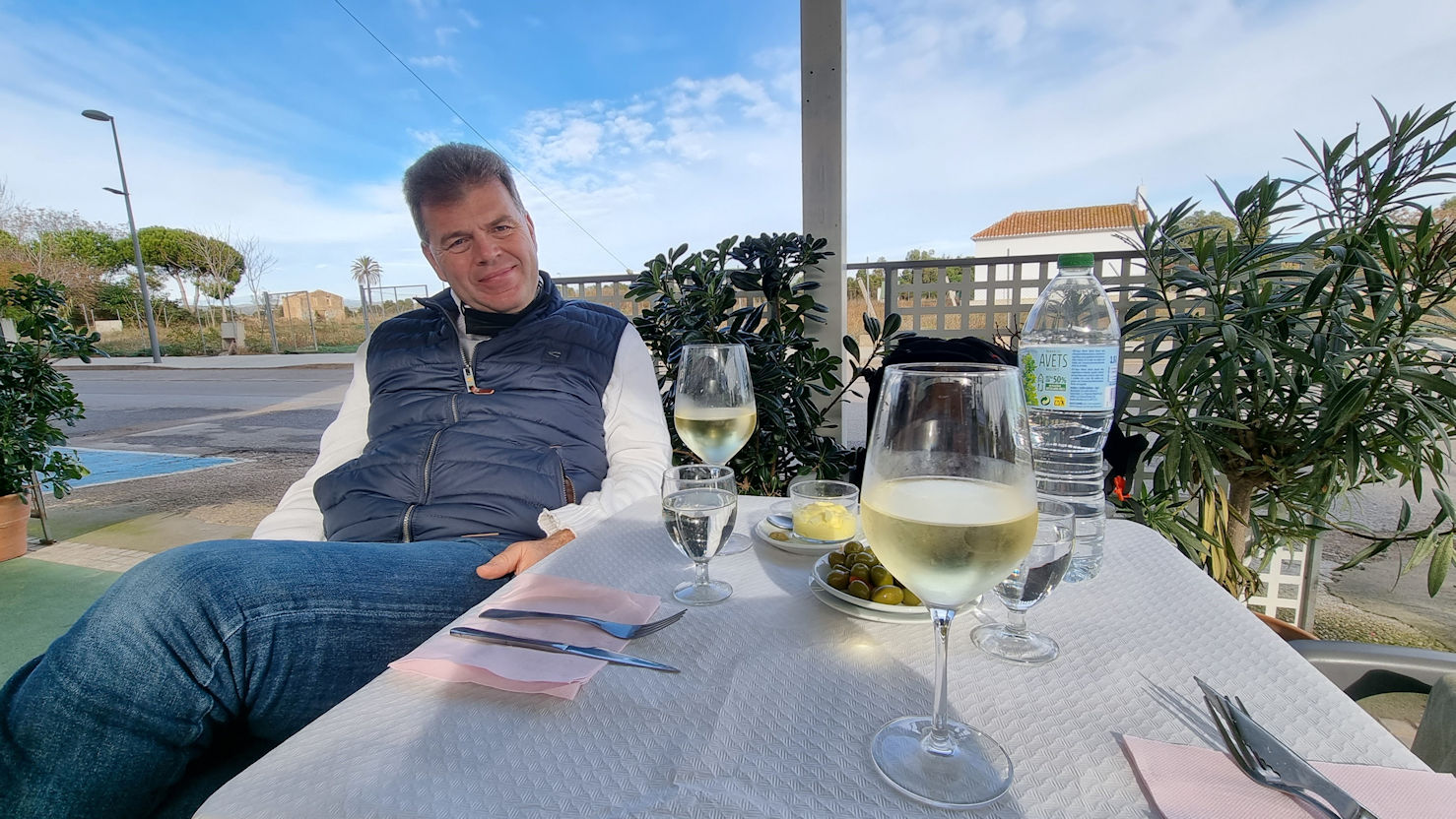 Kurz nach 13 Uhr geht es erneut zur kleinen Bar. Wir setzen uns auf die leere Terrasse, bestellen uns ein paar Oliven, etwas Aioli und anschließend eine Paella. Dazu ein Glas trockenen, kühlen Weißwein.