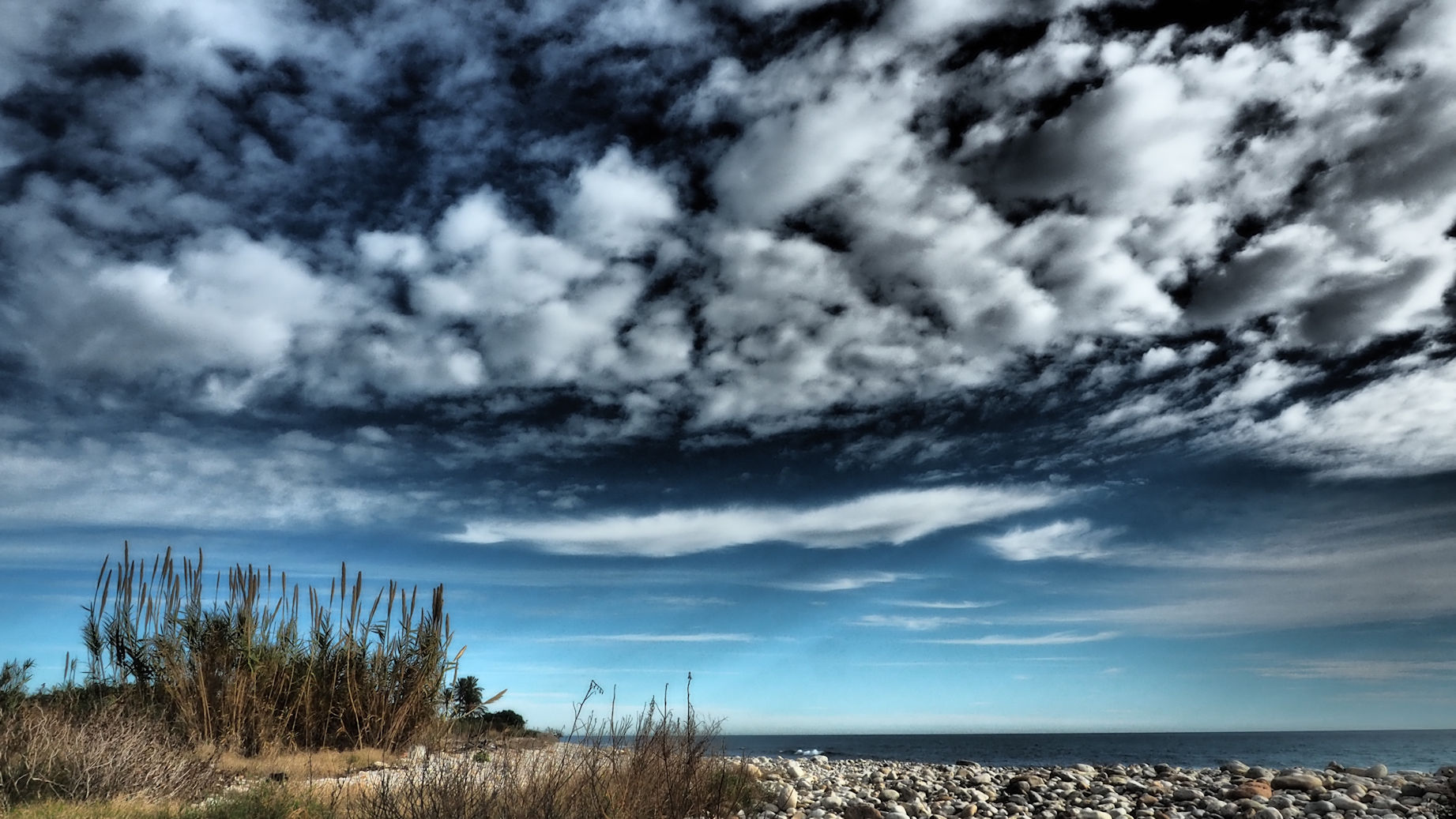 Und dann heißt es Ausruhen. Wir genießen die Sonne vorm Womo, den Blick auf’s Meer und das Klack-klack-klack der Kiesel, die von den Wellen bewegt werden. Und beim Blick auf den Strand entdecken wir viele wunderschöne, mit Fossilien bestückte Steine, die allesamt Geschichten erzählen könnten.