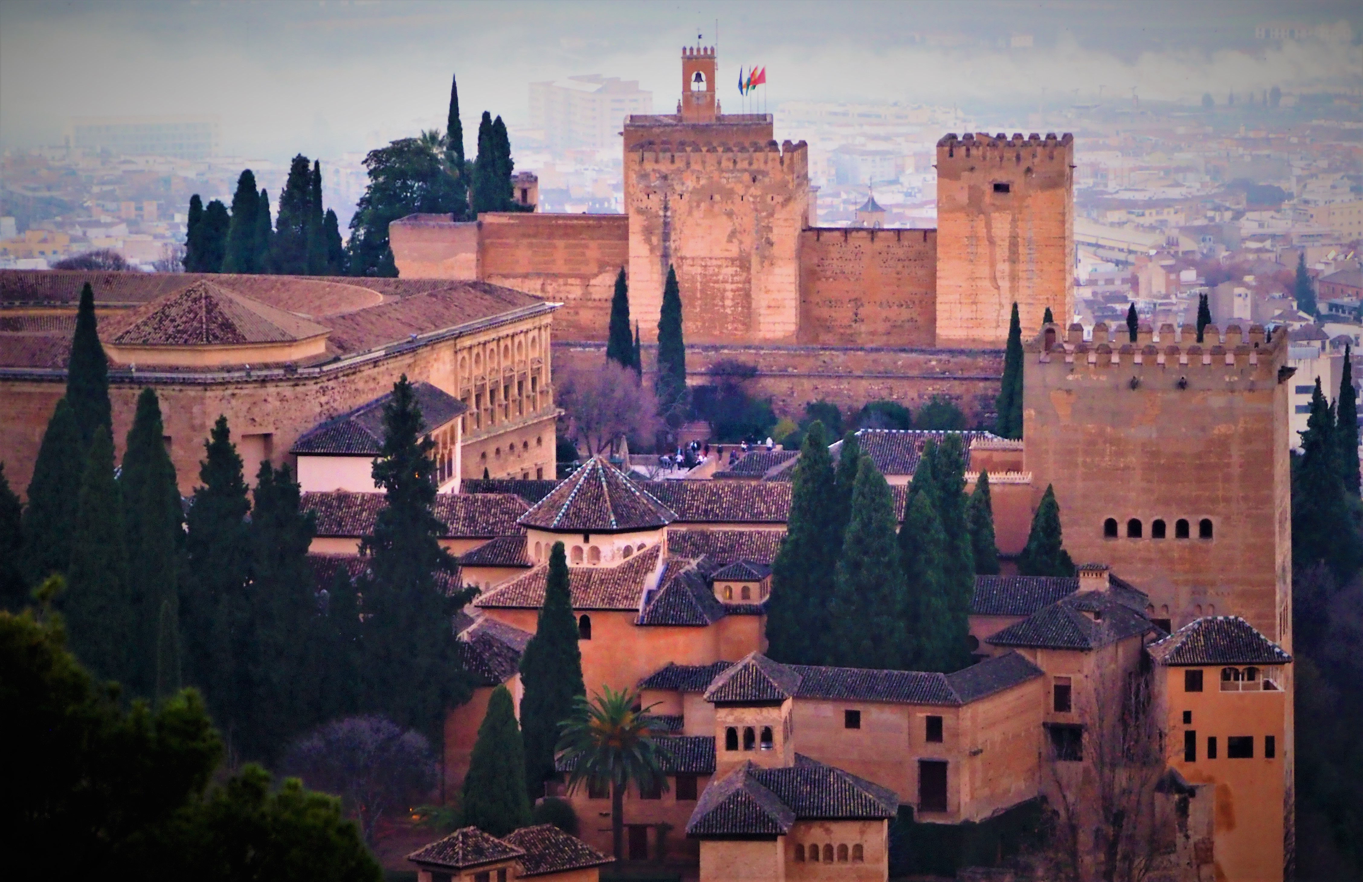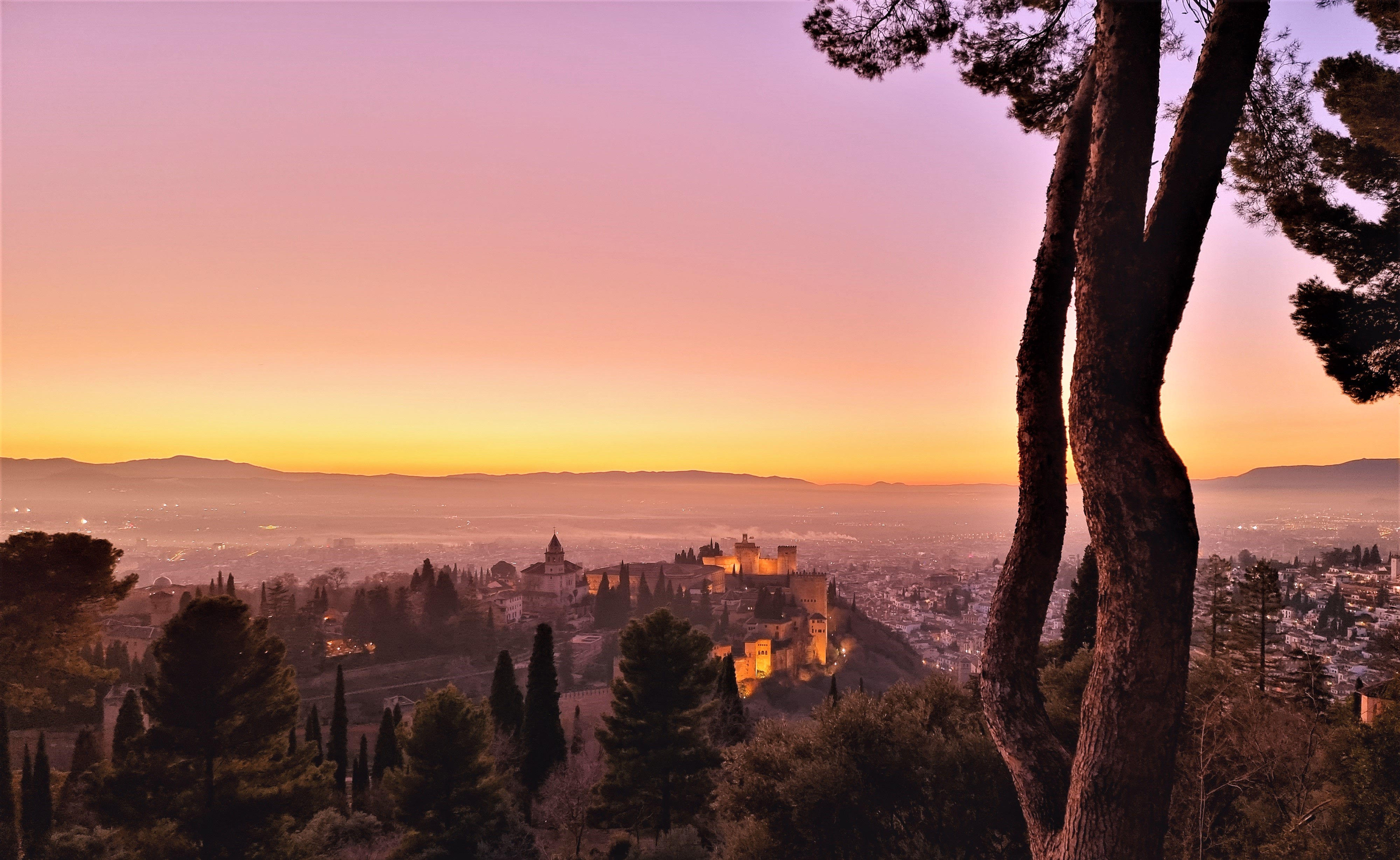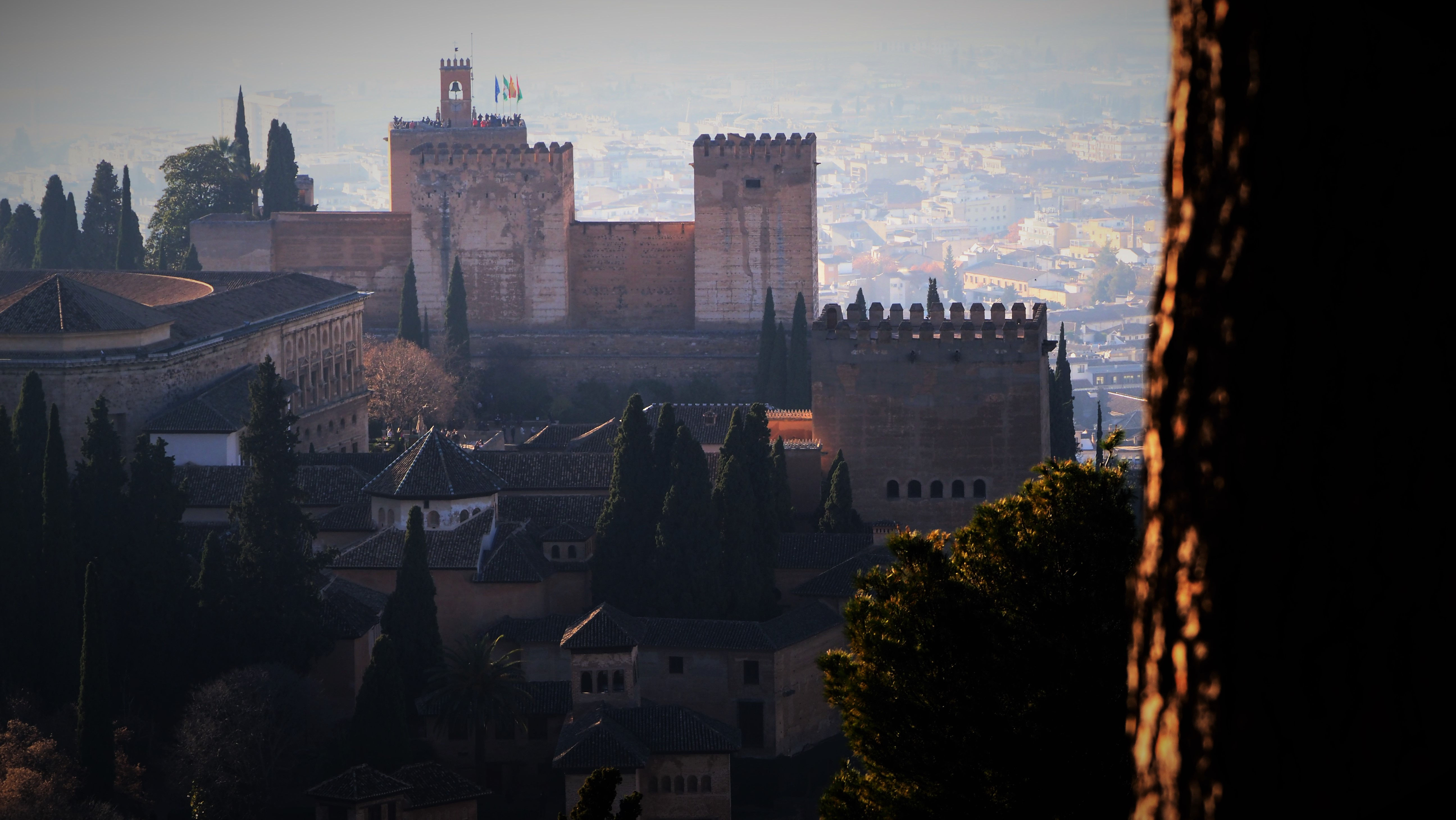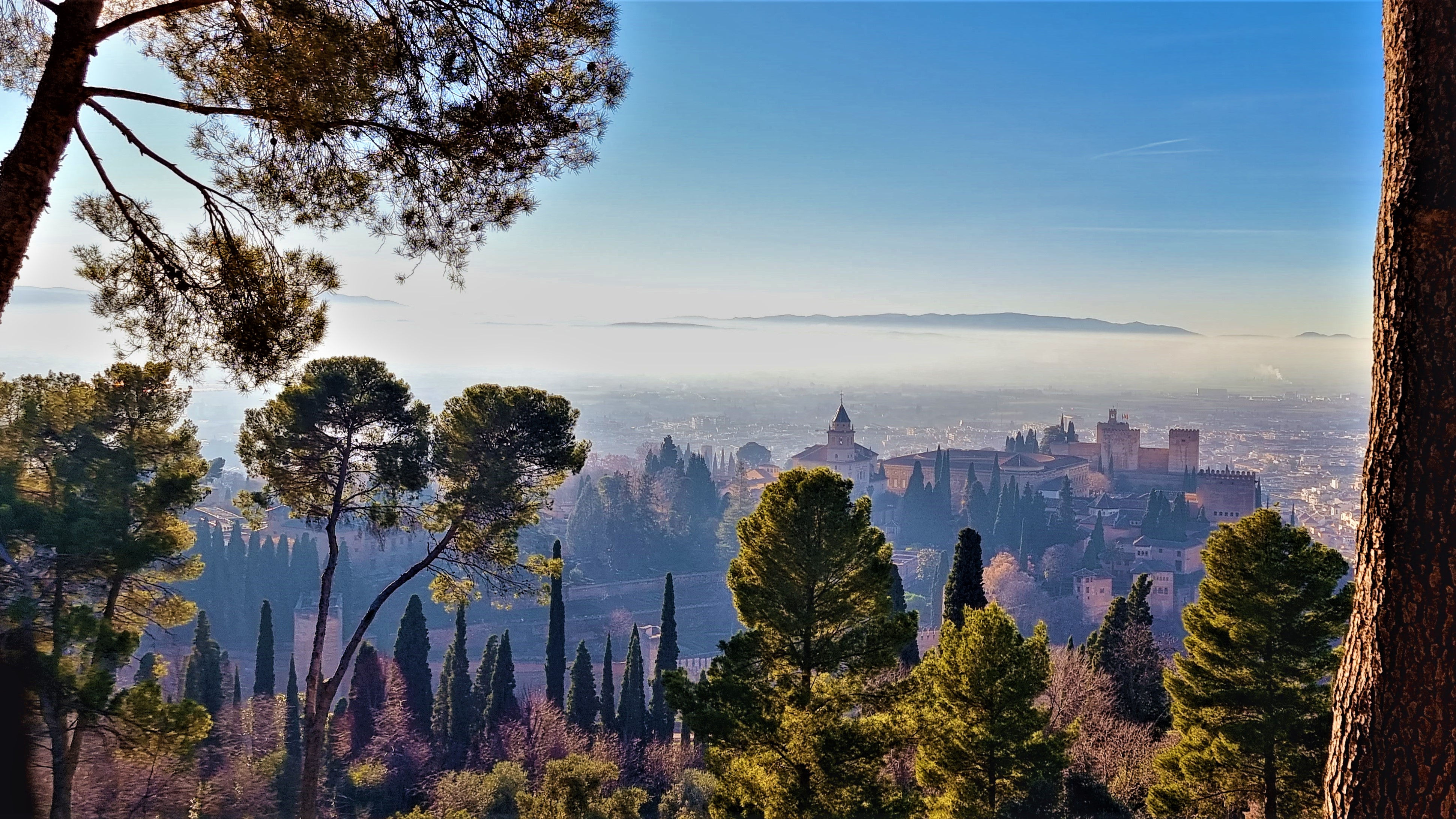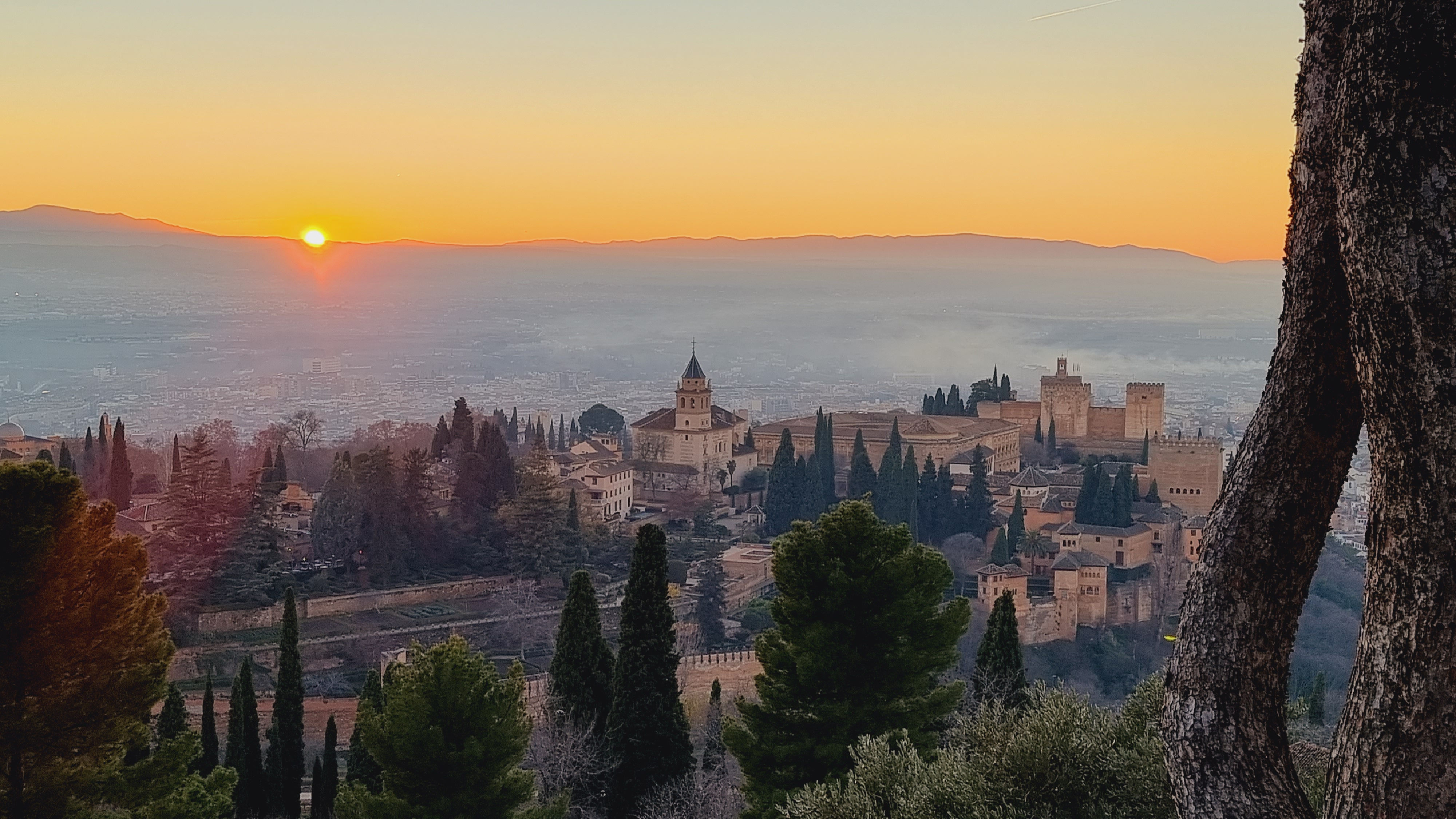Und dann dieser Ausblick. Die Sonne steht schon relativ tief und taucht die nebeldurchschleierte Landschaft in ein goldenes Licht. Unsere etwa 4 km lange Wanderung endet gegen halb 6 mit kurzem Umziehen (wärmere Sachen), die Fellnasen in den Wagen packen, alles Fotoequipment bereit machen und dann geht es wieder zurück zum Aussichtspunkt. Denn um 18:06 Uhr geht heute die Sonne unter. Und diesen Moment möchten wir gerne oberhalb der Alhambra genießen.