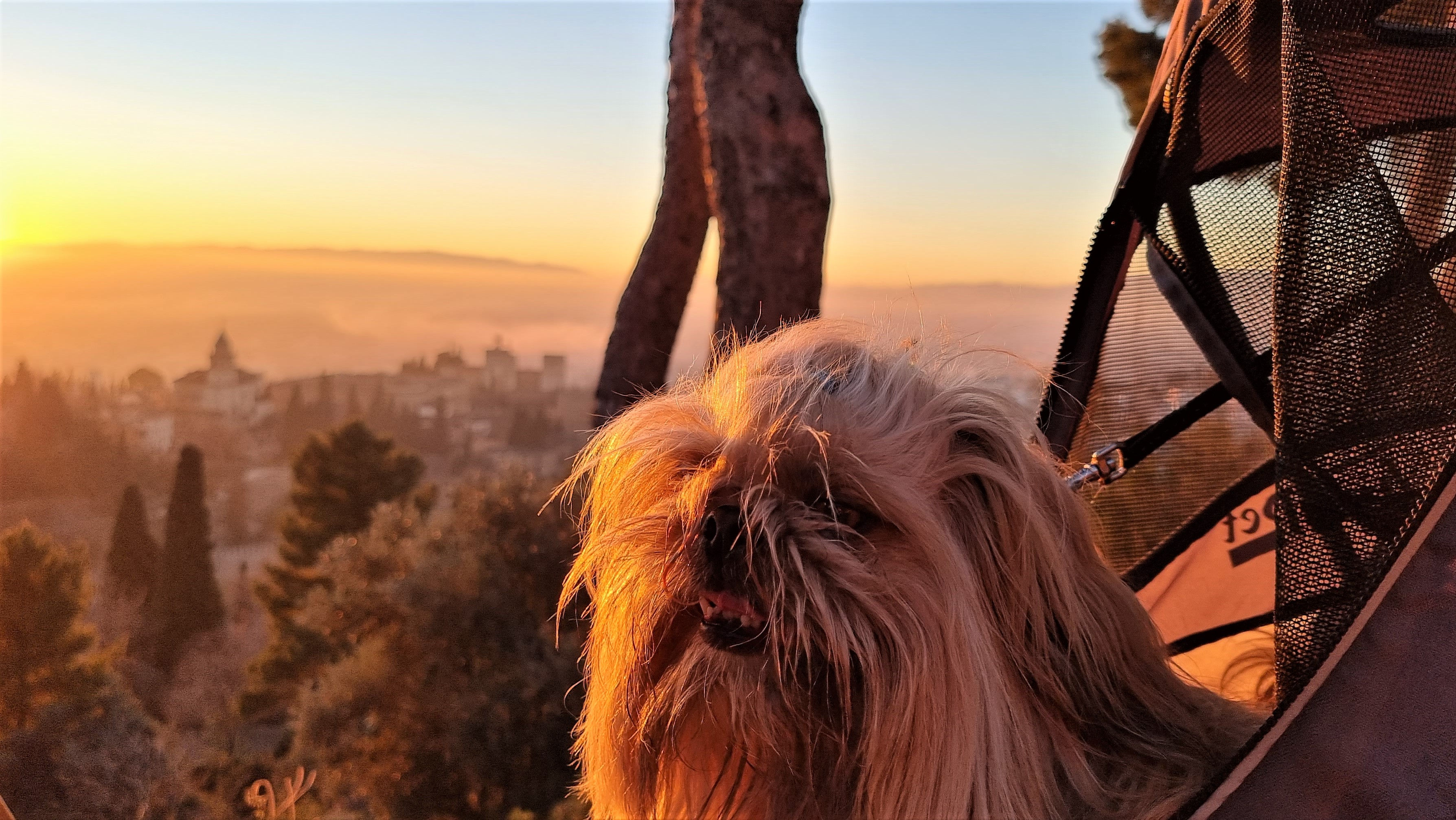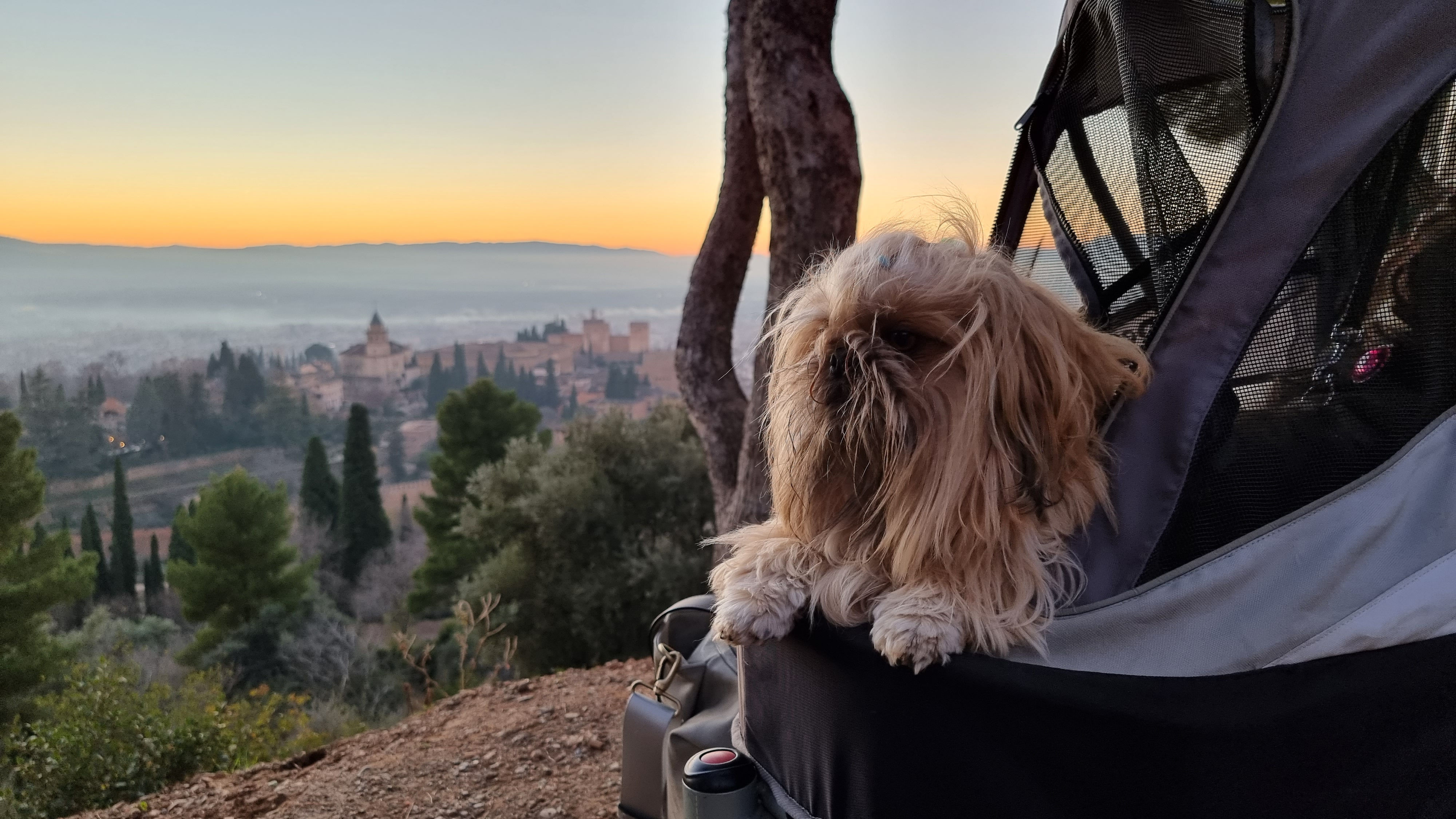 Hier in der Sonne hat es nicht nur, wie fast die ganze Fahrt über 18 Grad, sondern das Thermometer steigt bis auf 25 Grad an. Neben unserem Womo befindet sich ein „Platz an der Sonne“, auf dem wir einen Willkommensweißwein genießen. Kurz bequeme Laufschuhe an und es geht zu Fuß zum Aussichtspunkt über der Stadt. Ein wirklich toller Weg führt hier oberhalb der Alhambra in eine atemberaubende Landschaft. Unsere Fellnasen und auch wir genießen die kleine Wanderung.