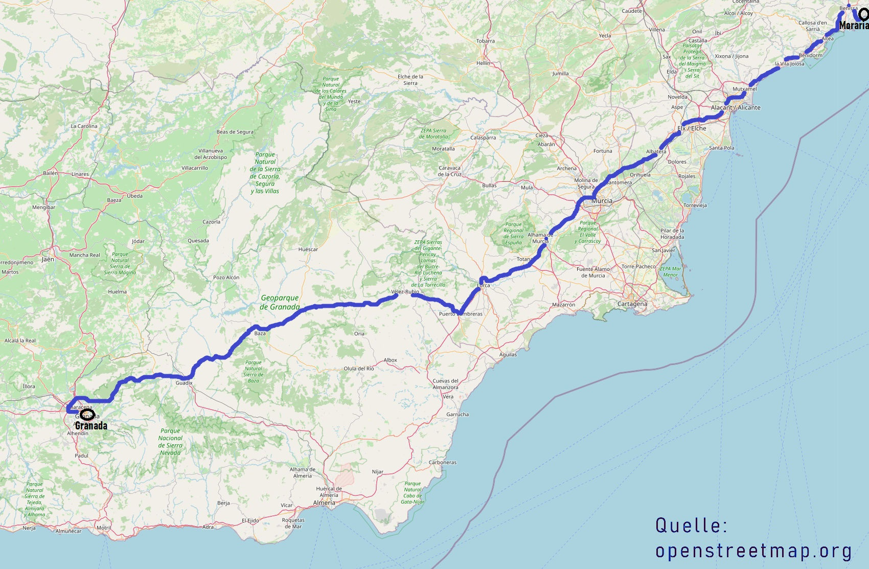 Wirklich erst heute Morgen um 9 Uhr wissen wir, dass unsere Tour in Richtung Granada weitergehen soll. Und so starten wir über die AP7 in Richtung Alicante, weiter über Elche nach Murcia und über Lorca und Guadix schließlich nach Granada. Und die Landschaft, die wir passieren, ist einfach nur atemberaubend schön. Palmenhaine, Gebirge, Oliven, Kiefernwälder, die Sierra Nevada…am liebsten hätten wir alles im Bild festgehalten, denn es ist wunderbar vielseitig und die Fahrt, immerhin 450 km, sehr kurzweilig.