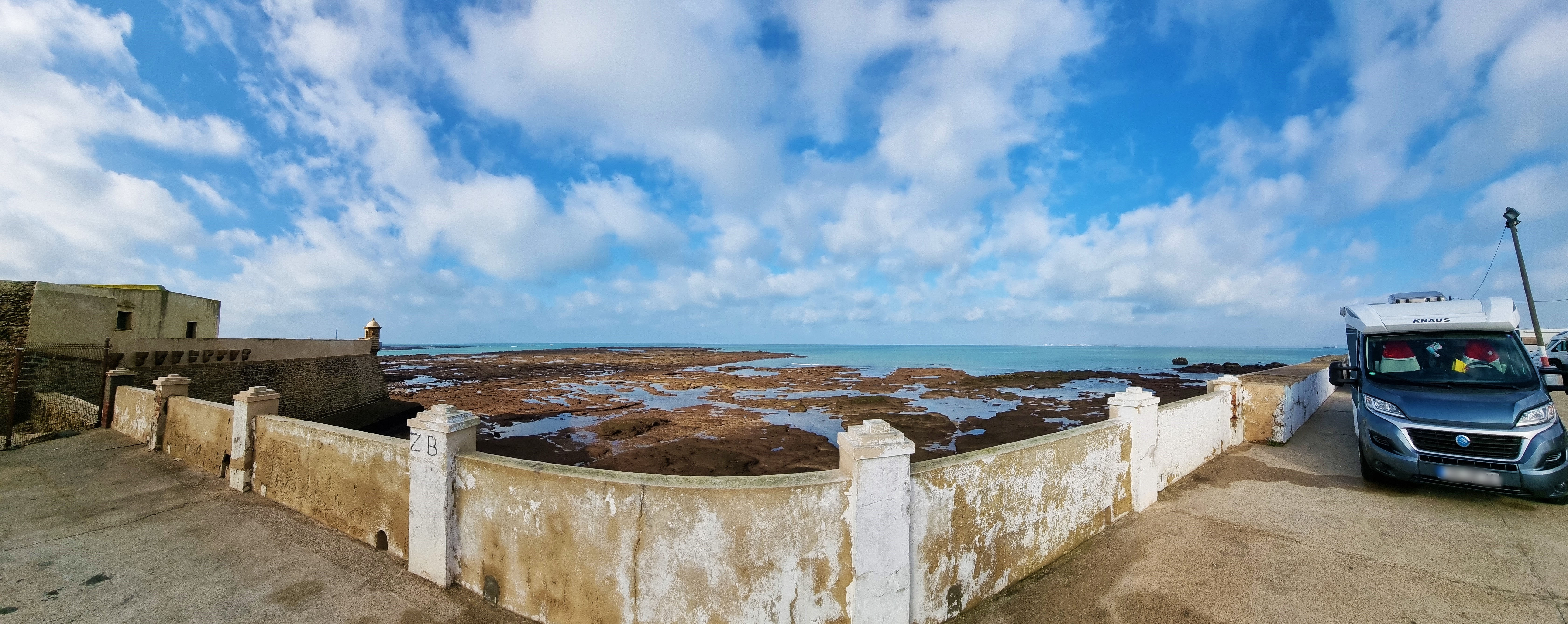 Nach einer leuchtturmdurchblinkten, ruhigen Nacht – es hatte tatsächlich neulich in einem der Womoforen eine Beschwerde darüber gegeben, dass der Leuchtturm nachts nicht abgeschaltet wurde!?!- stellt sich die Frage: Bleiben oder Fahren? Nochmal in diese wundervolle Stadt eintauchen oder einen neuen Stellplatz finden? Atlantik oder Mittelmeer? Alle diese Fragen stellen wir uns bei unserem Morgenkaffee mit Blick auf die Festung Santa Catalina auf diesem außergewöhnlich schönen Stellplatz.