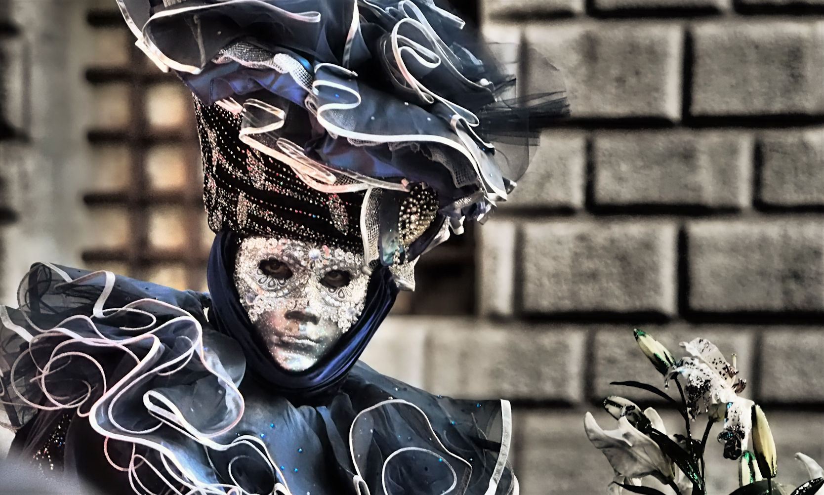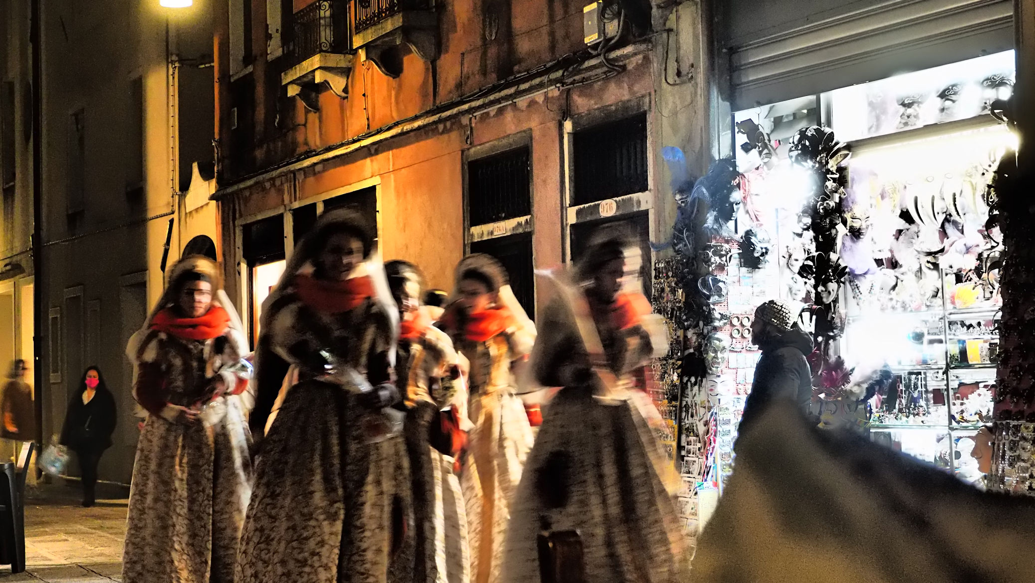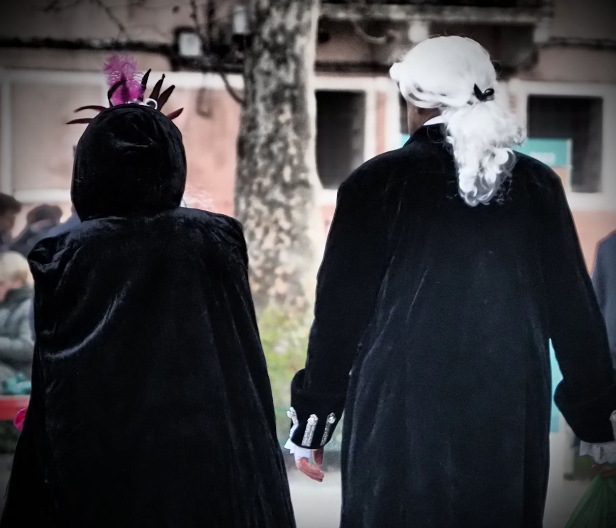 Kurz darauf folgt ein wundervoll gekleidetes Paar, echte Venezianer, die unterwegs nach San Marco sind. Die ersten Masken, die wir treffen.