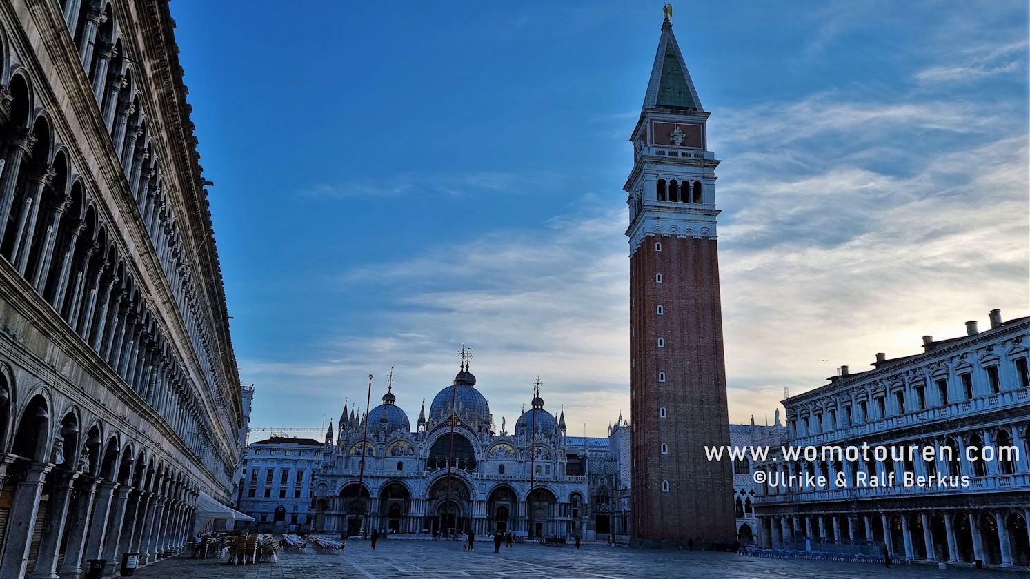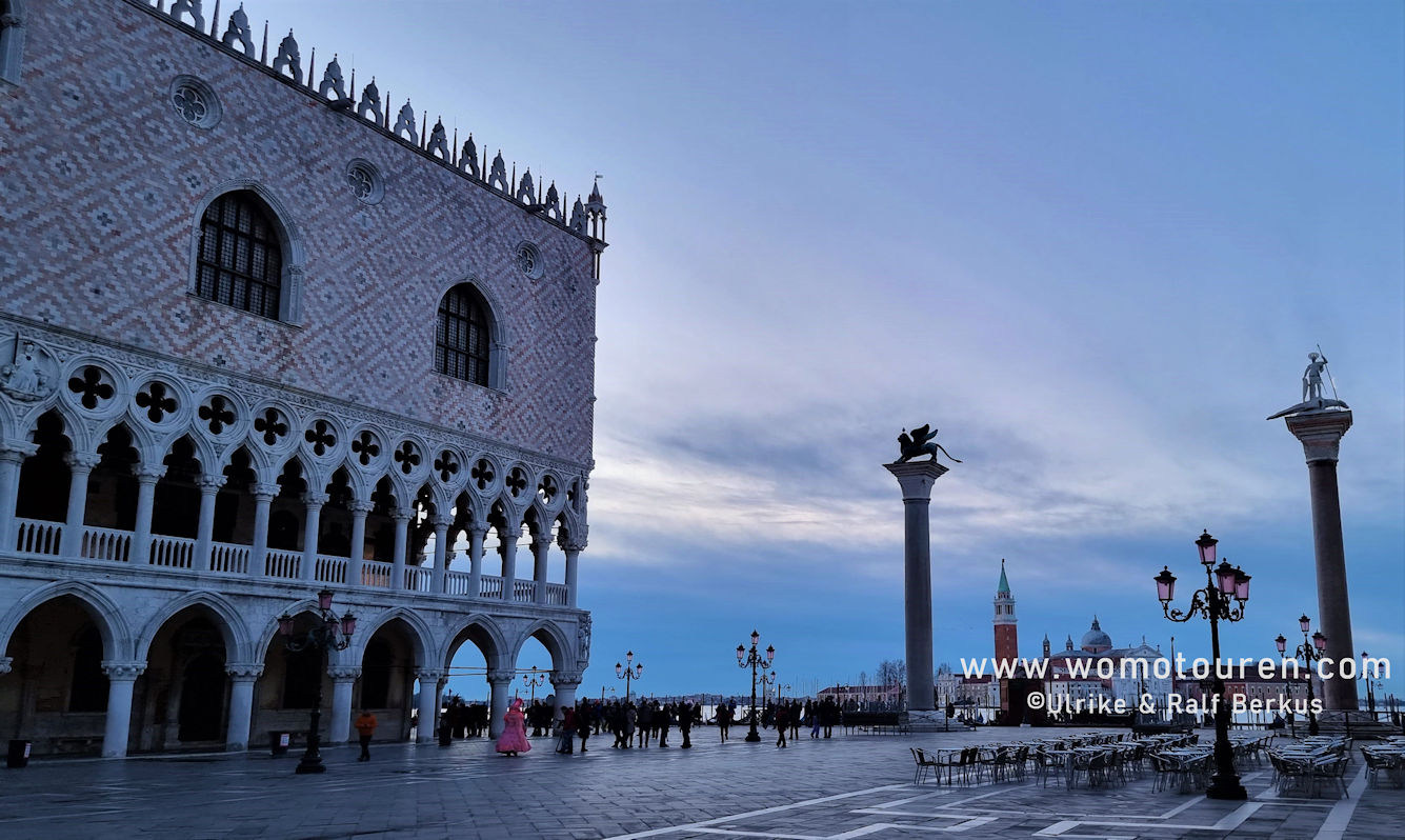 Die blaue Stunde hat bereits begonnen, als wir uns in Richtung Piazza San Marco bewegen. Die Gassen sind nahezu menschenleer. In der ein oder anderen Bar scheint es bereits etwas zu geben. Aber wir wollen gerne direkt zur Piazza durchlaufen. Während wir die Rialtobrücke alleine überqueren, nimmt die Anzahl der Menschen, die bereits unterwegs sind, mit jeder Annäherung an den großen Platz zu. Besonders Menschen mit riesigen Kameraausrüstungen sind jetzt unterwegs. Alle auf der Suche nach dem perfekten Foto. Bauwerke wie Campanile, Dom oder Dogenpalast, die sonst begehrte Motive sind, dienen nun lediglich als nette Kulisse.