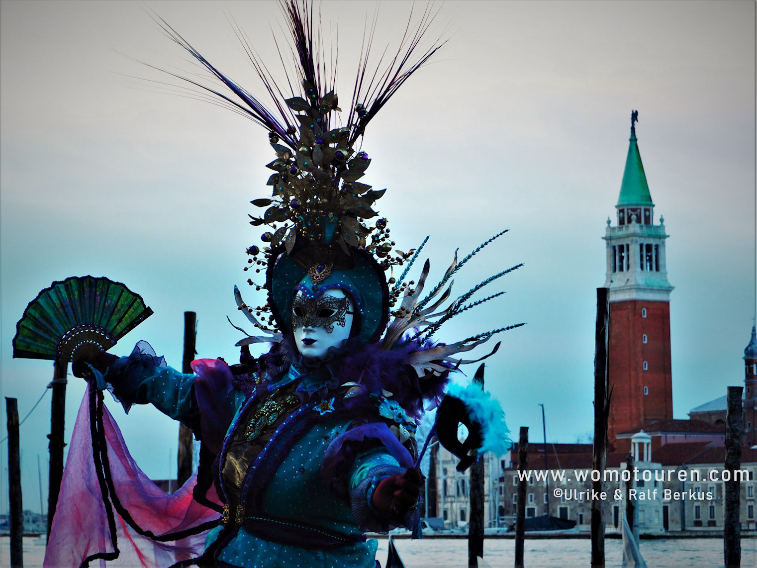 Die meisten Masken findet man am Riva dei Schiavoni. Hier liegen die Gondeln vorm Dogenpalast und bieten eine atemberaubende Kulisse mit Blick über die Lagune zu den beiden Gotteshäusern Santa Maria della Salute und der Chiesa di San Giorgio Maggiore. Und jetzt kommt genau der Moment des Herzklopfens. Wir sind aufgeregt. Werden unsere Fotos so gut, wie die tollen Fotos, die wir bereits in Netz gesehen haben? Funktionieren die Kameras? Sollen wir wirklich mit Blitz fotografieren?