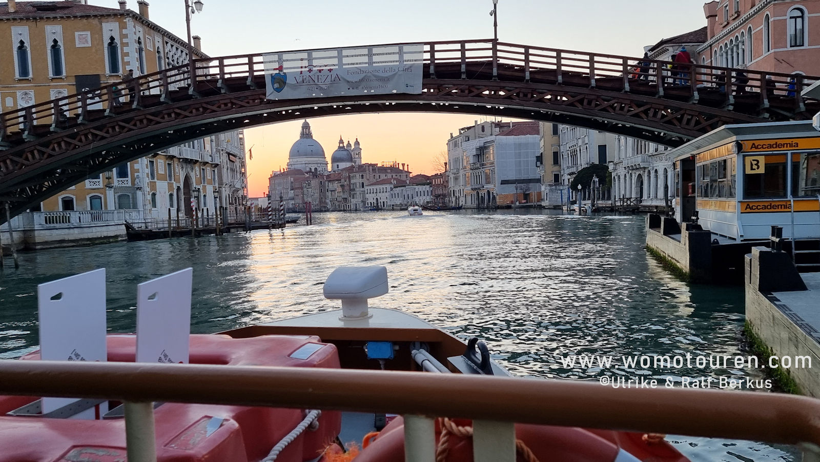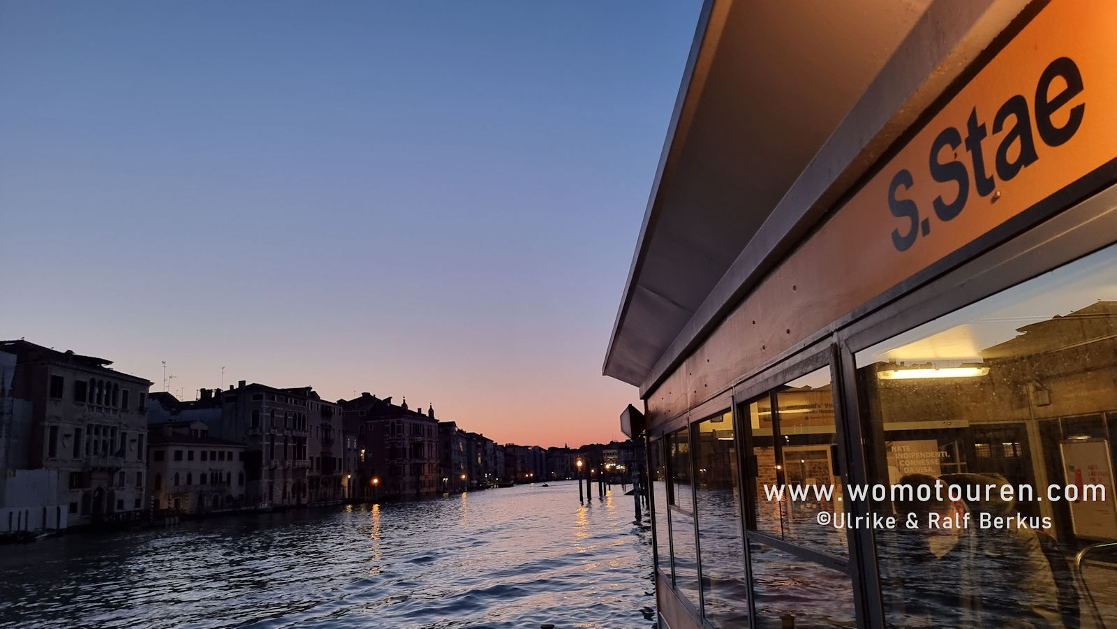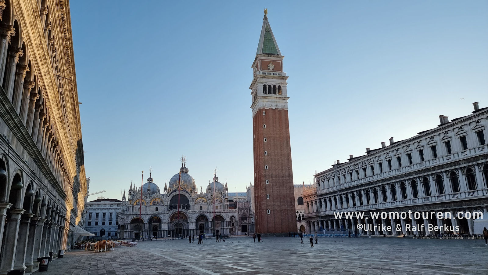 Zeit um zur nächsten Haltestelle zu laufen, nämlich nach San Stae. Hier geht es dann um kurz nach halb 7 los in Richtung Markusplatz. Im goldenen Schein der Sonne erreichen wir die Szenerie. Und heute Morgen sieht es hier ganz anders aus. Nicht nur das Licht ist anders. Es sind auch kaum Masken da.