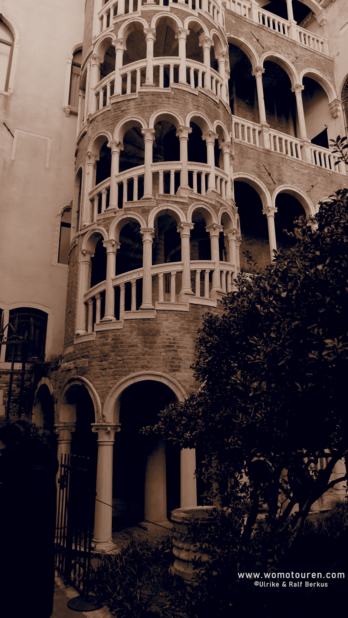 Über wundervolle enge Gassen mit vielen Lokalen, an Santa Maria Gloriosa dei Frari vorbei erreichen wir gegen 20 nach 4 die Haltestelle San Toma‘, die wir gleich am nächsten Halt in Sant Angelo wieder verlassen. Durch ein paar schöne Gassen und über teilweise verträumte Brücken gelangen wir kurze Zeit später zum Palazzo Contarini del Bovolo – bekannt für seine Wendeltreppe, die etwas vom Torre Pendente in Pisa zu haben scheint.